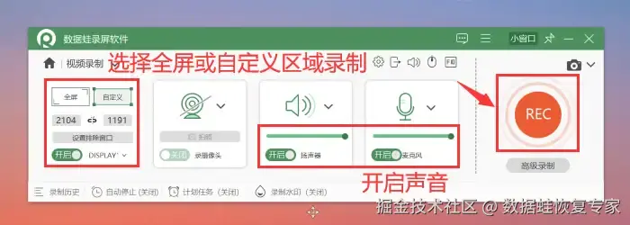 第二步:在录制页面里设置分辨率(可全屏录制或者自定义区域录制),对录制声音等进行调节,然后点击 【REC】 按钮进行录制。