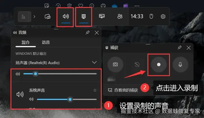 使用方法:打开您需要录制的游戏页面,在键盘上按下 【Win+G】 ,设置好录制的声源后点击录制按钮进行录屏。