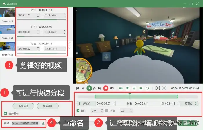 步骤3:录制完成的游戏视频,可以直接进行预览并保存,也可以点击进入 【高级剪辑】 页面对视频进行快速分段、剪辑、增加特效等操作,还能对视频进行重命名,方便您日后的查找与分享。