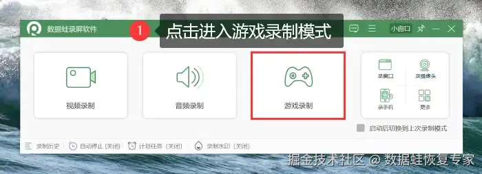 步骤1:在您需要进行游戏录制的电脑上安装好数 据 蛙录屏软件。进入软件的主页面,选择 【游戏录制】 模式。