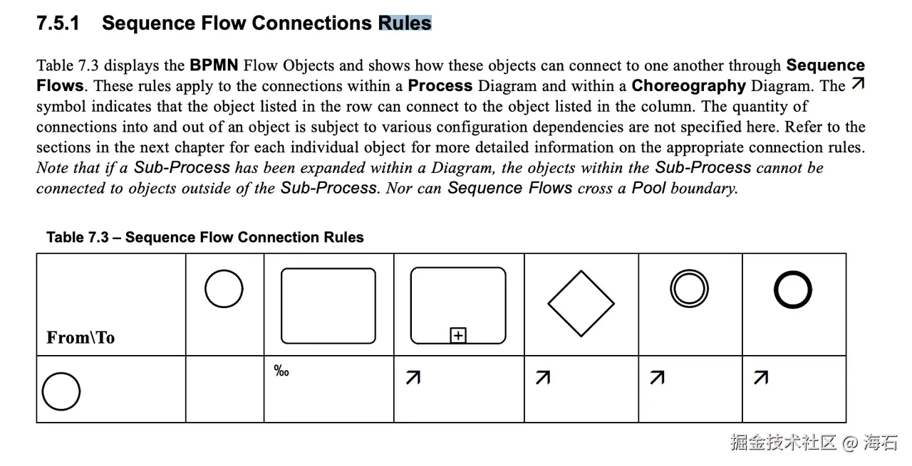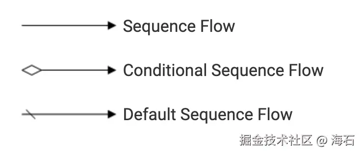 - 顺序流(Sequence Flows) : 用于连接流对象,表示流程的顺序和方向。其实Flow有很多种类型,但是我们仅需关注「顺序流」,「顺序流」又有3种类型:普通顺序流、条件顺序流、默认顺序流,这三种类型为我们的流程设计器铺垫了走不同分支的基础。