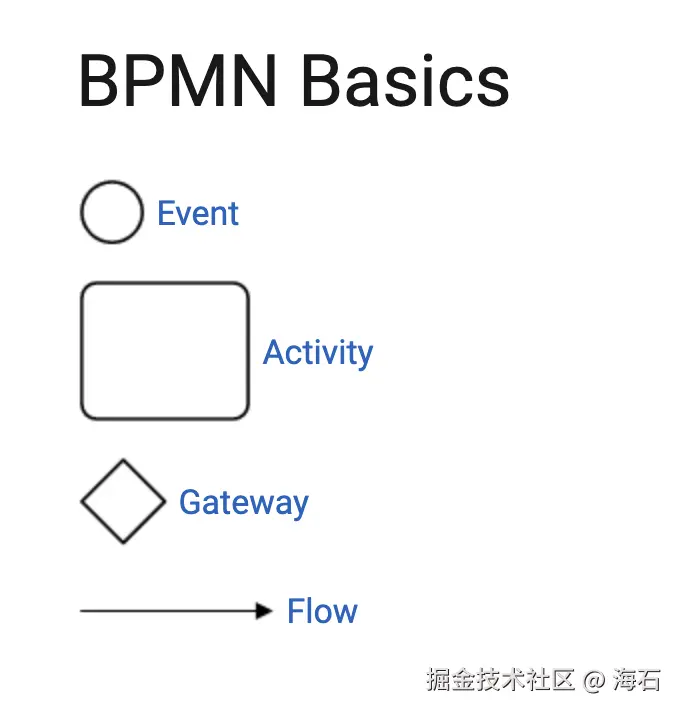 在前面几个章节的内容里,BPMN 出现了很多次,包括这个技术栈的名称也是bpmn.js,那么,到底什么是 BPMN ?