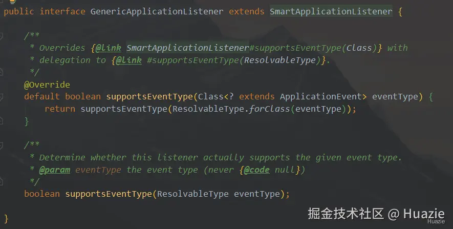 阅读上述源码,可以看到 ConditionEvaluationReportListener 实现了 GenericApplicationListener 接口,继续翻看 GenericApplicationListener 接口源码:
