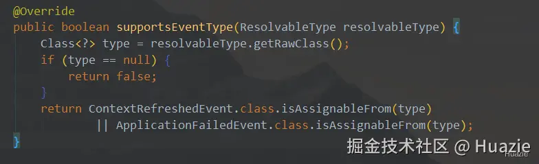 现在我们再来看看 ConditionEvaluationReportListener 中重写的 supportsEventType(ResolvableType) 方法: