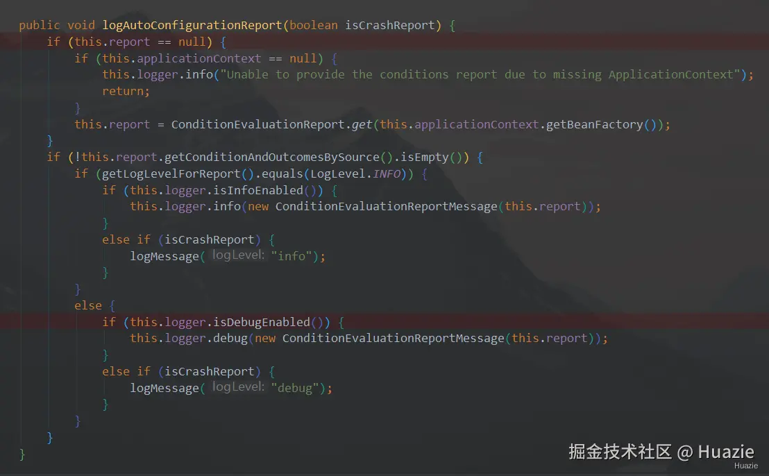 ConfigurableApplicationContext applicationContext: 应用上下文对象ConditionEvaluationReport report:条件评估报告对象,用于报告和记录条件评估详细信息。LogLevel logLevelForReport:条件评估报告的日志级别,包含TRACE,DEBUG,INFO,WARN,ERROR,FATAL,OFF