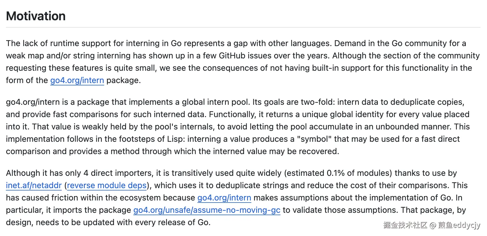基于 Go unique 官方提案,我简化了一下内容。要做这个主要原因是:Go 缺乏运行时的驻留支持,这与其他语言存在差距。