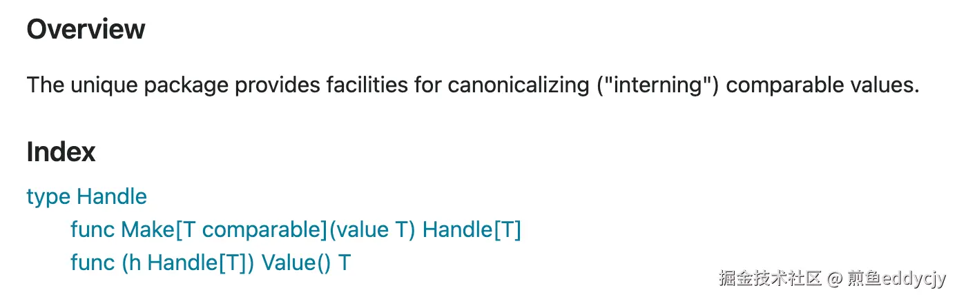 标准库 unique,文档非常的短小精悍。这次 Go 官方连个 example 都没有直接给。