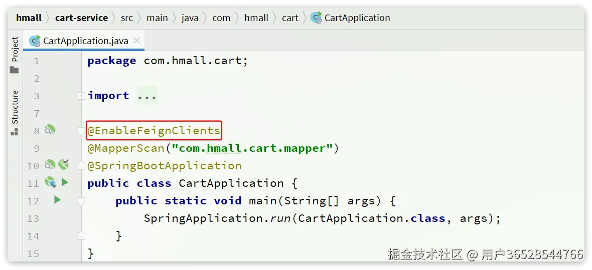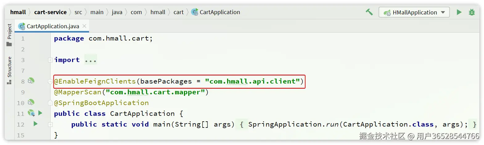 接下来,我们在cart-service的CartApplication启动类上添加注解,启动OpenFeign功能: