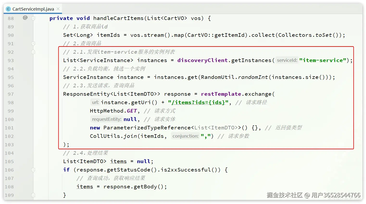 有了上述信息,OpenFeign就可以利用动态代理帮我们实现这个方法,并且向http://item-service/items发送一个GET请求,携带ids为请求参数,并自动将返回值处理为List<ItemDTO>。