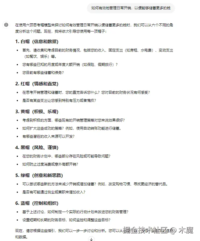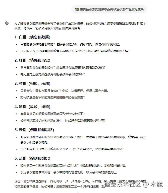 3. 通过切换不同的思考帽,引导用户从多个角度分析问题。