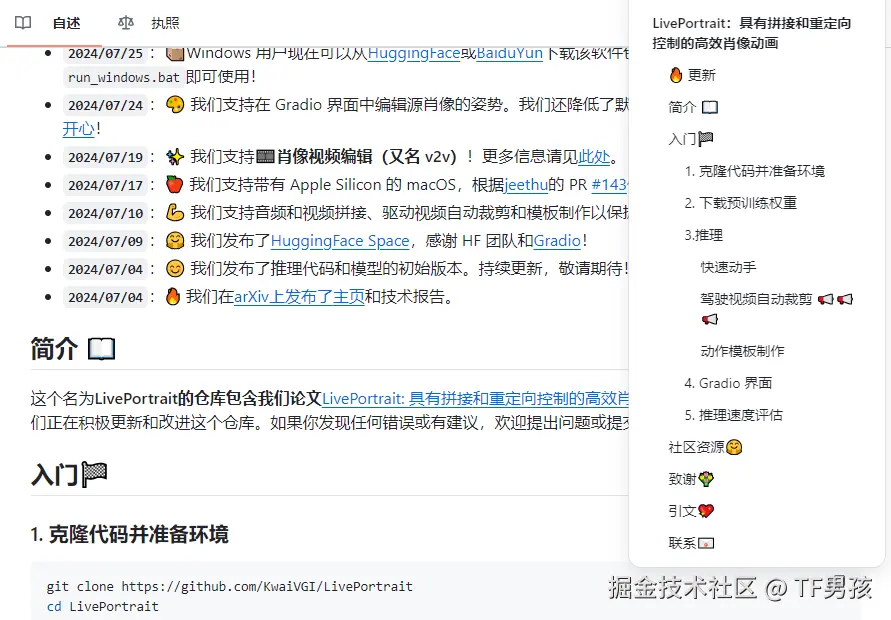 对于技术人员,最直观的方式就是去官方的ReadMe.md文档查看 github.com/KwaiVGI/Liv…