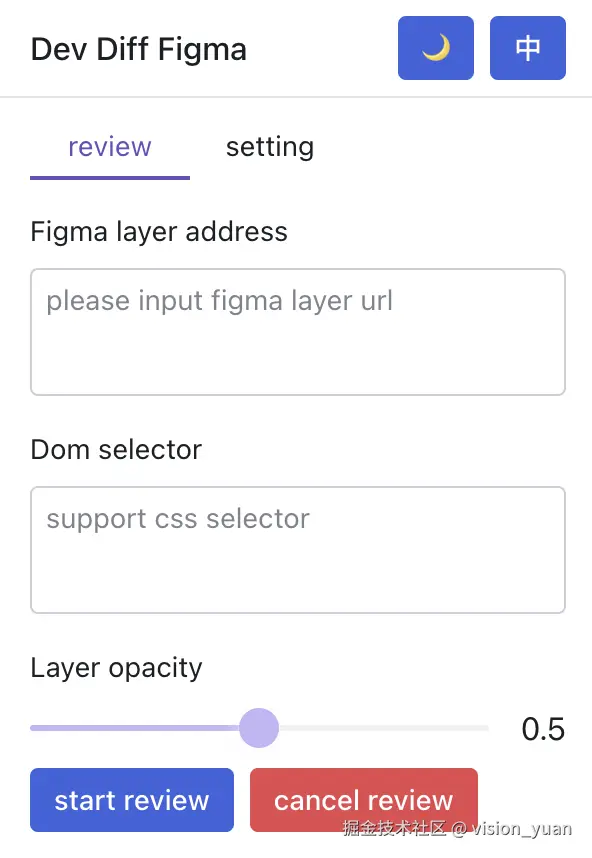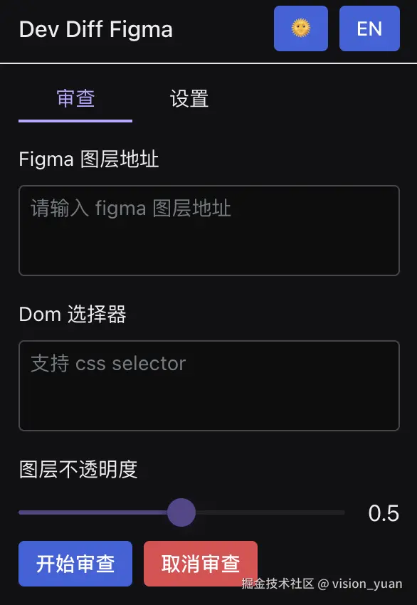 dev diff figma 对于我们前端开发人员来说真是犹如神助,它可以支持整个页面图层与开发效果整个页面进行直观的比对,也可以一个页面中某一个区域进行直观的比对;此外,使用体验也非常 nice ,支持中英文切换 ,支持日夜间模式;