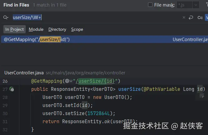 找当我们线上有一个功能出现了问题,前端说调用我们接口userSize/1出问题,那么我们第一时间肯定是想快速的在代码中找到这个接口,如果你提前知道接口使用了{id}能通配接口参数,那么可以使用Ctrl+Shift+F ,再输入userSize/\W+ 使用正则查到对应的接口,如下图所示: