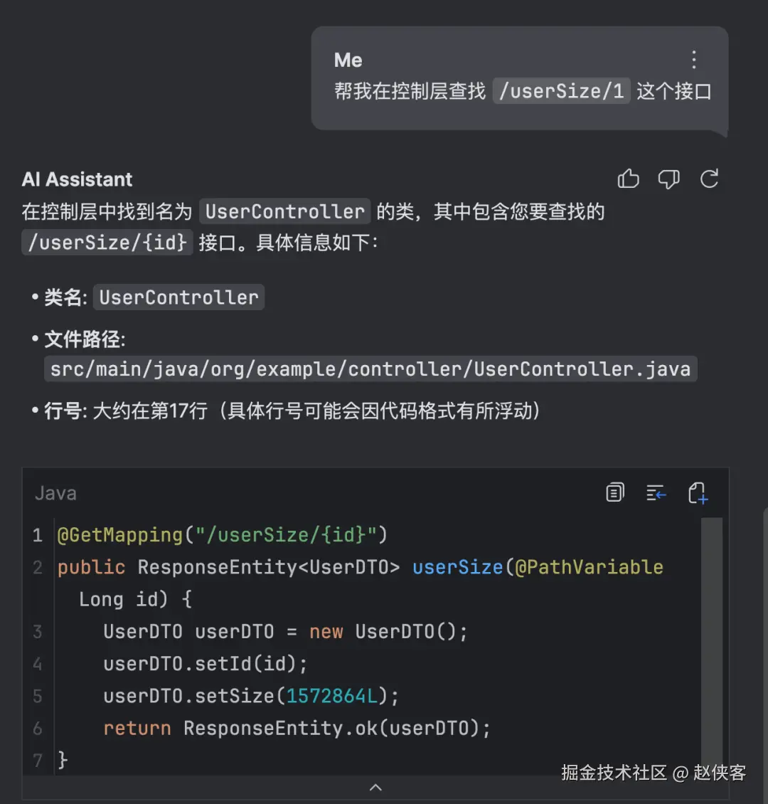 可是当接口是别人定义的,可能项目都是别人开发的,人都可能已经走了,你根本不知道接口的定义格式,所以正则也不好用的,这种情况如果使用传统方法在大型项目中想找到这个接口的代码位置甚至都有点困难,这时AI就来了: