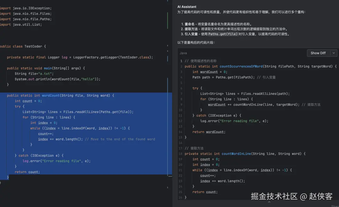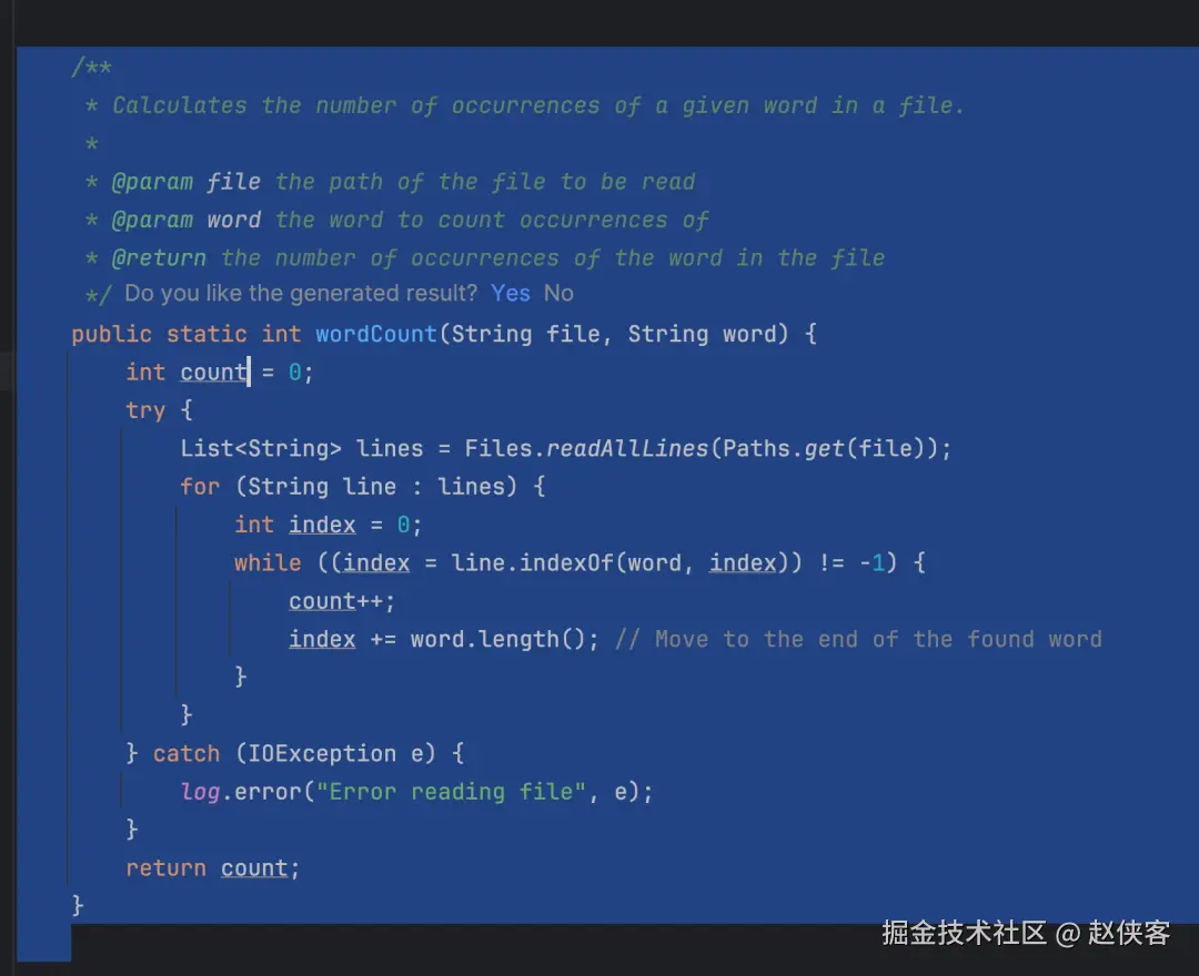 可以看出生成的代码速度还是非常快的,生成的代码也是像模像样的,功能也是正常的,还使用了try-with-resource来自动关闭文件流,有的新手可能在这里还会忘记关闭文件流,感觉AI非常的老练。