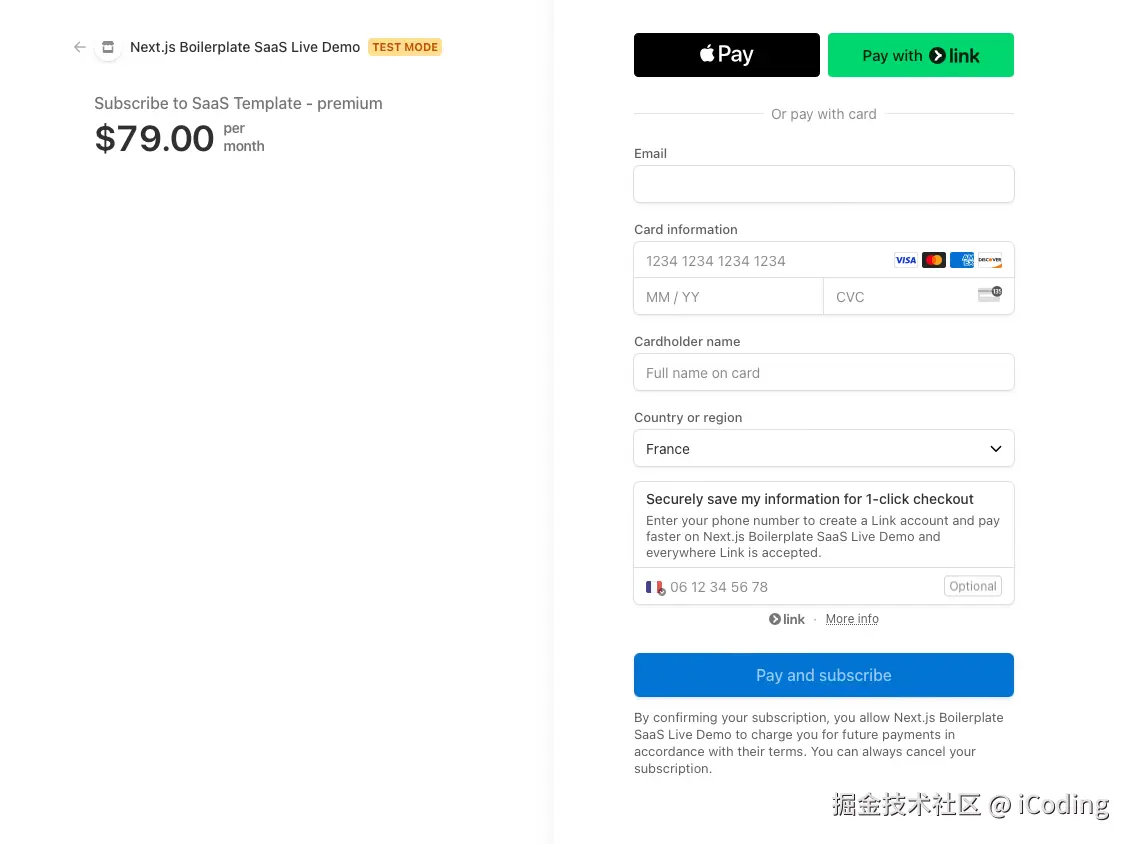 Stripe 无缝处理付款和订阅。借助 Stripe SDK,我可以轻松地将支付处理集成到我的Next.js应用程序中。Stripe 提供了一个结账页面,用户可以重定向到该页面。此页面不仅提醒用户他们即将订阅的计划,还提醒每月或每年的价格。最后,用户可以输入他们的信用卡详细信息并订阅所选计划。
