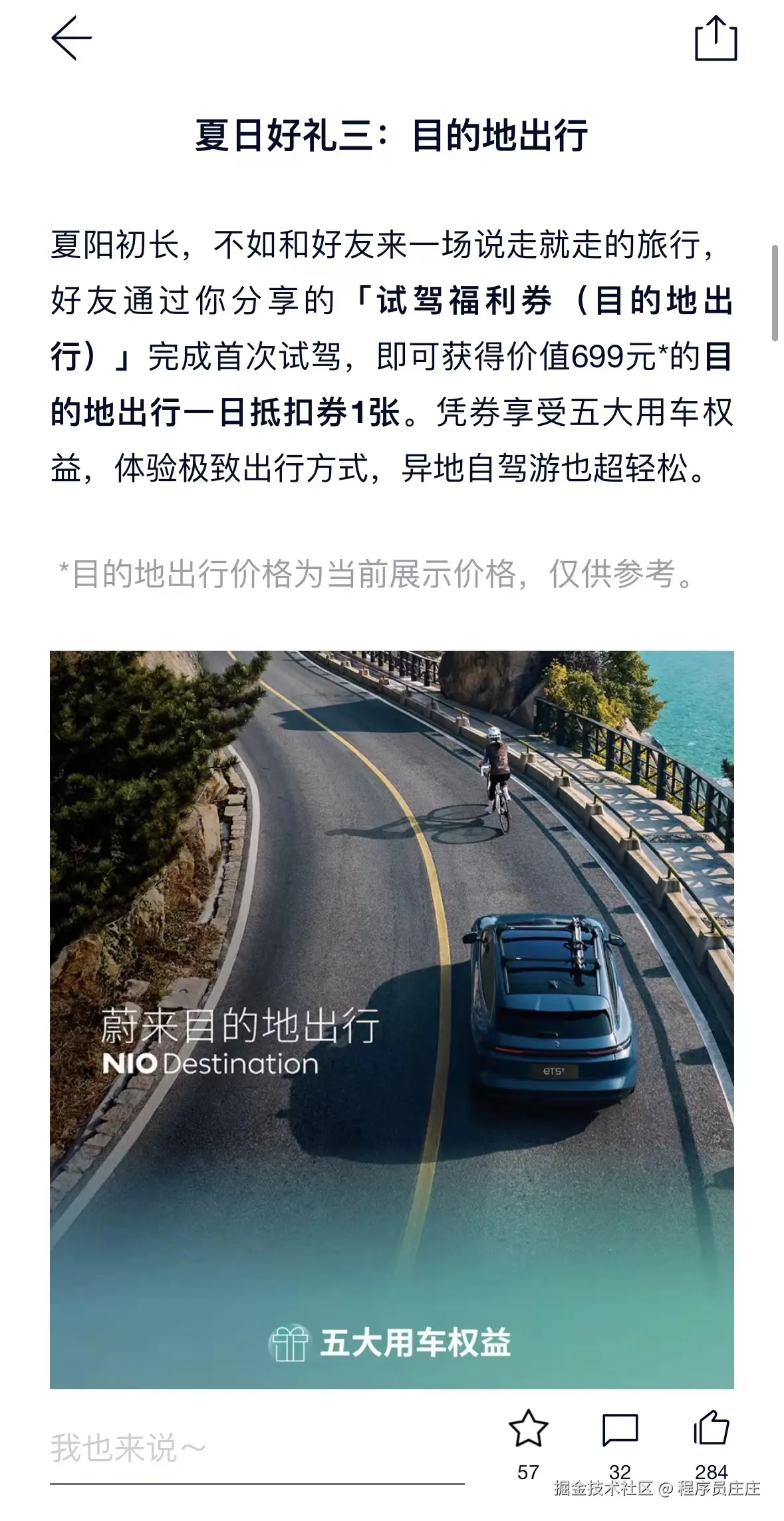 后来发现蔚来每个月还有好朋友券这种东西,蔚来车主专属的邀请券,试驾完能得到专属的礼品。于是拜托车主朋友在车主群里帮我搞一张,试驾完果然送了 免费租车的体验券。让我体验了一天蔚来车主的生活,也让我开启了第一次自驾游的体验。 到了月底趁着活动还在又拜托朋友在车主群里问问,没想到这个时候已经相当紧俏,无奈之下从闲鱼上花了大几十买了张券。虽然有投入成本,但是免费租车一天,还是蔚来这样的豪华车型,怒省几百,着实让人心里爽歪歪。