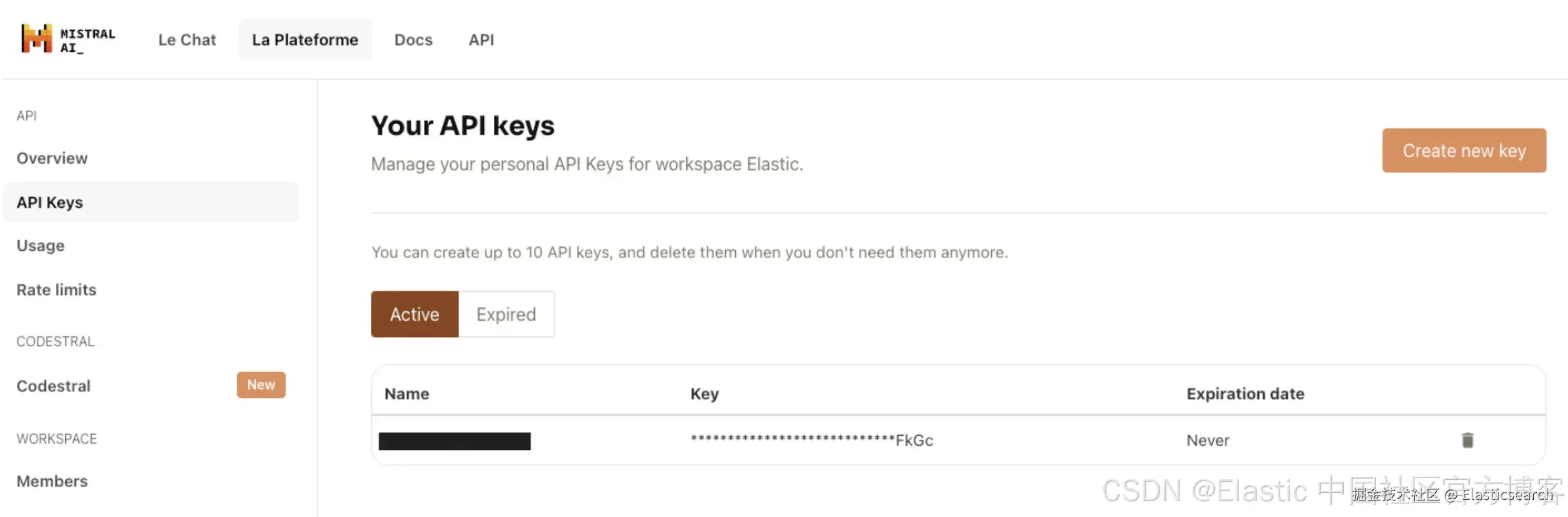在 Mistral AI 的 La Plateforme 上生成使用密钥。