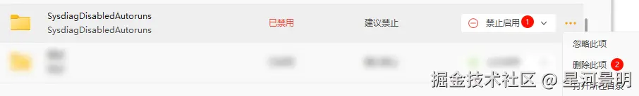 很不错啊,找到了,并且采用了禁止启用,即上图中的操作 ①。然后我就放心没管了,结果在第二天再一次打开我的电脑时,我又看到了那个文件夹。于是我又采取了上图中的操作 ② - 删除了此项,再次重启,很好还是没用,实际上删除掉它后都不用重启直接重新打开这个 启动项管理 就会发现它又被扫出来了。