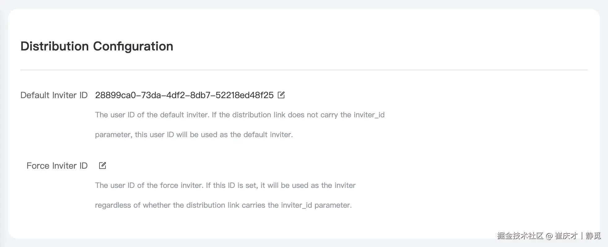 - 强制邀请人 ID:如果设置了强制邀请人 ID,那么除了这个强制邀请人,其他人都无法从该站点获得分销返利,后台也看不到分销推广的入口。该站点所有注册用户都会被绑定到这个强制邀请人上面,所有的消费返利都是强制邀请人的。
