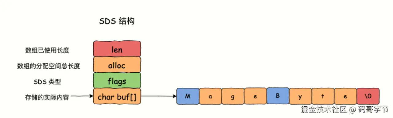 SDS 结构有一个 flags 字段,表示的是 SDS 类型。实际上 SDS 一共设计了 5 种类型,分别是 sdshdr5、sdshdr8、sdshdr16、sdshdr32 和 sdshdr64,区别在于数组的 len 长度和分配空间 长度 alloc 不同。