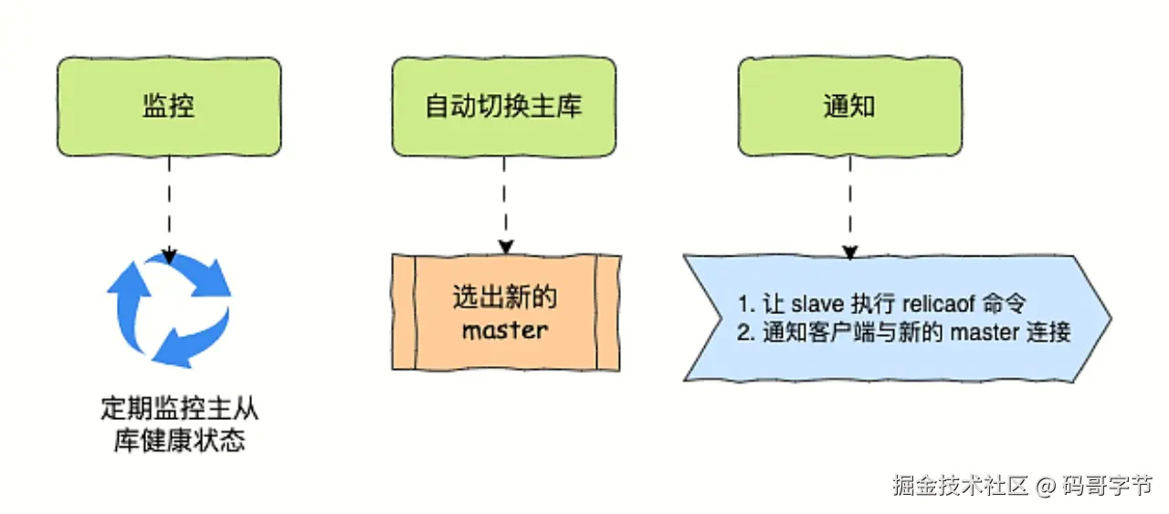 主从复制架构面临一个严峻问题:master 宕机,无法执行写操作,无法自动选择一个 slave 切换为 master,也就是无法实现故障自动切换。