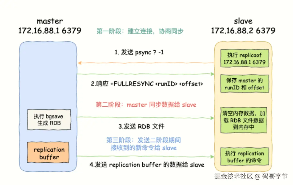 主从库第一次复制过程大体可以分为 3 个阶段:建立连接阶段(准备阶段)、同步数据阶段、发送同步期间接收的新写命令到 slave 阶段。