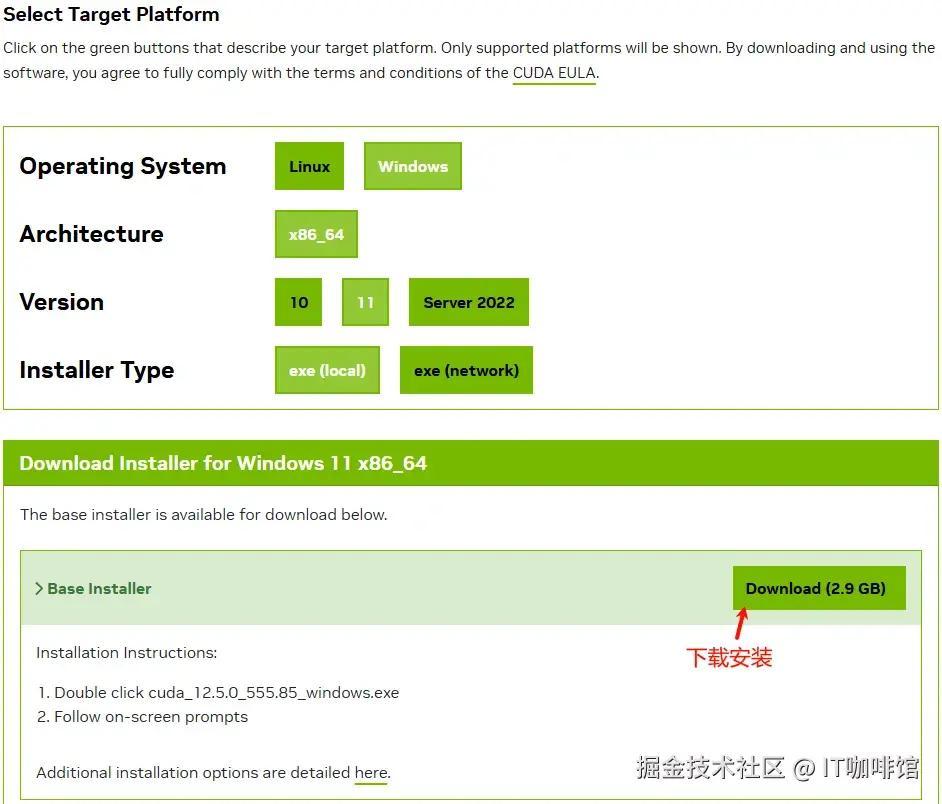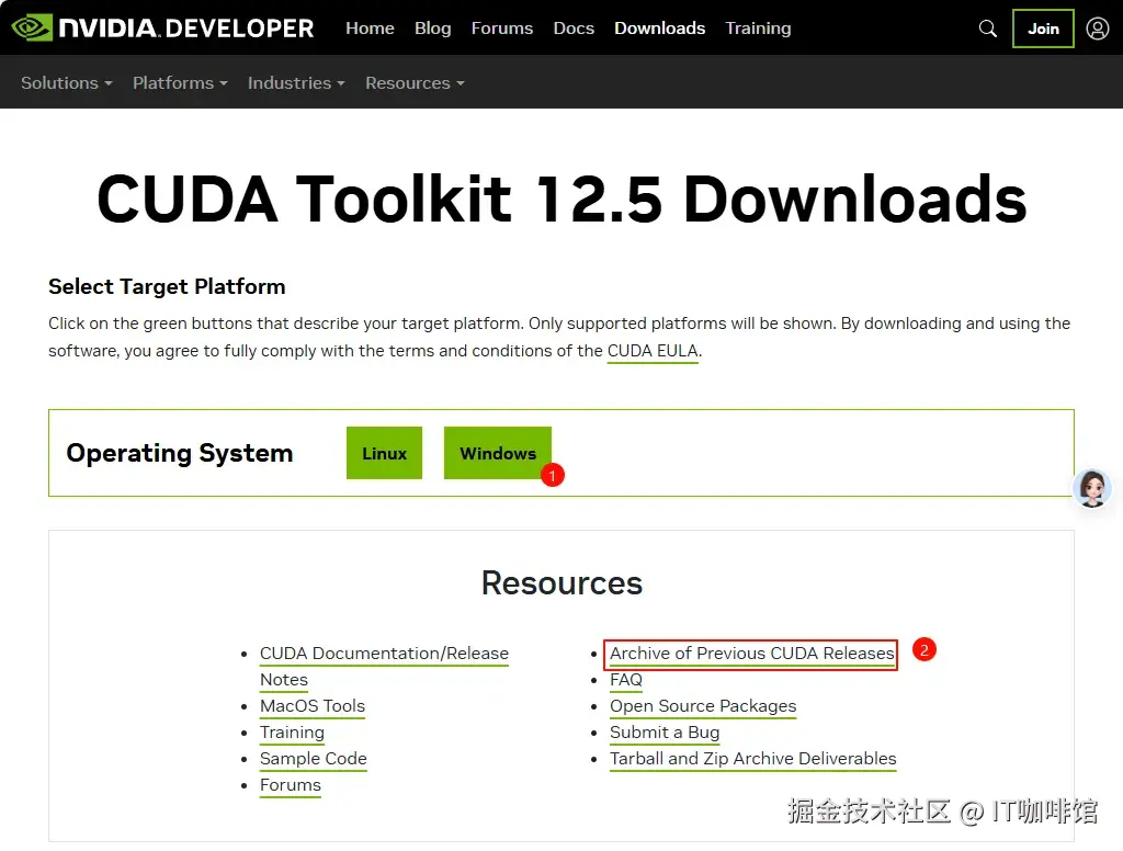 进入下载网址:developer.nvidia.com/cuda-downlo… 。当前最新版本为12.5。若安装12.5版本的话,可以点下图中1所示的操作系统选择按钮。若需要安装老版本,可以点下图中2所示的链接。