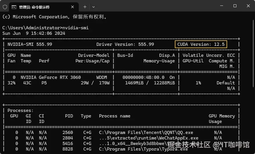 - 先判断本机显卡能支持的最高CUDA版本。在命令提示符中输入nvidia-smi,如下图所示,可以看到本机显卡驱动能支持的CUDA版本为12.5。