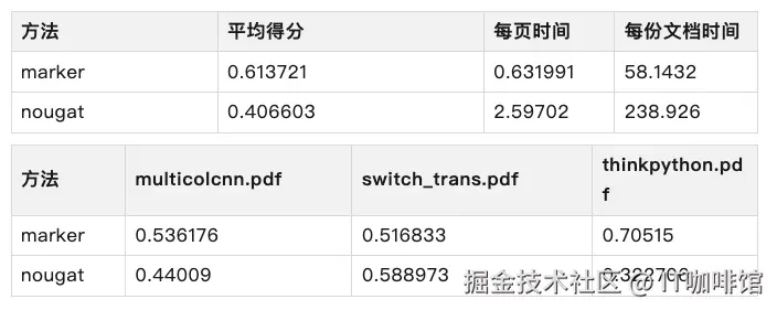 下表显示了 Marker 和 Nougat 在不同文档上的速度和准确性比较。Marker 的速度是 Nougat 的 4 倍,并且在 arXiv 之外的文档上具有更高的准确性。