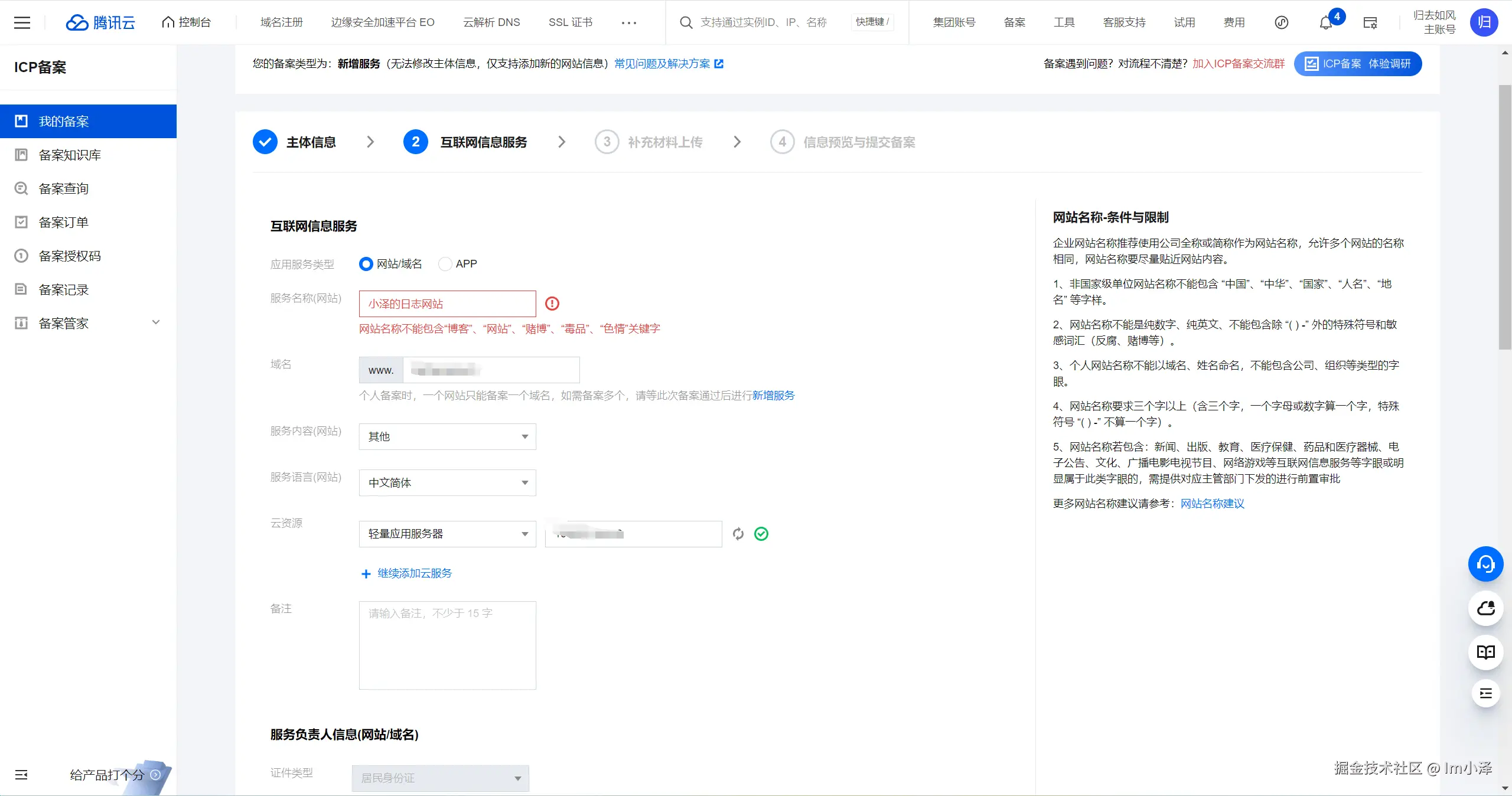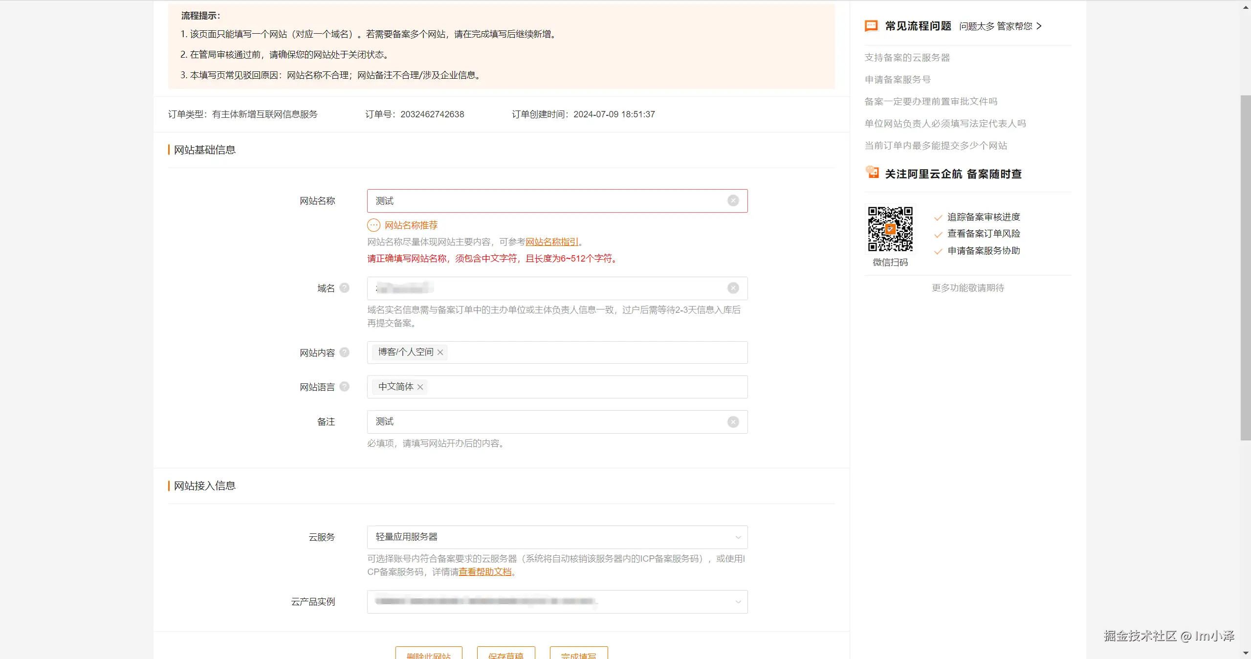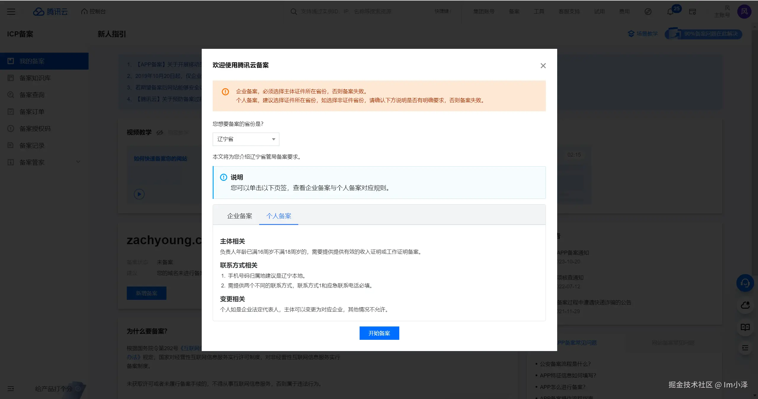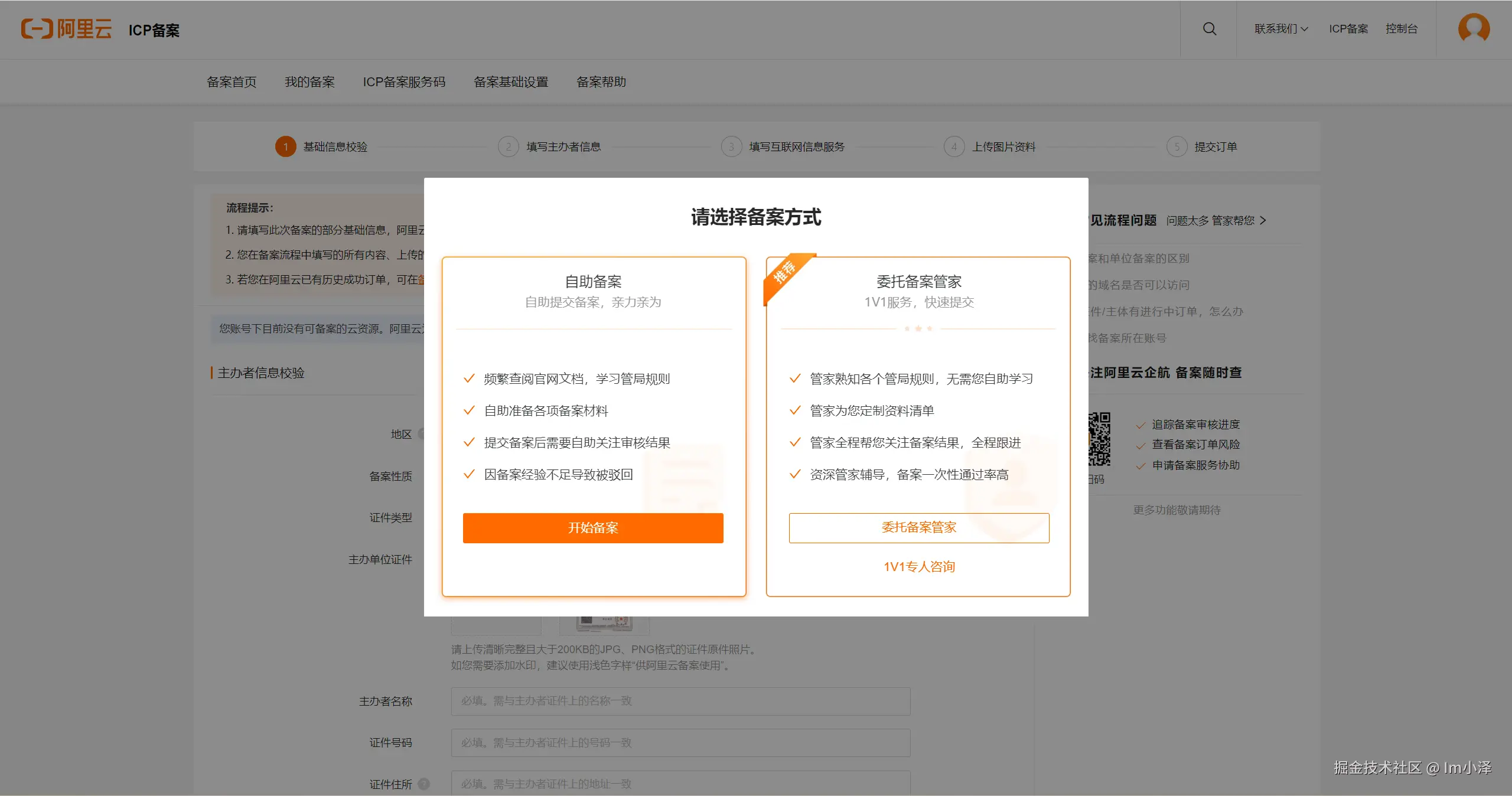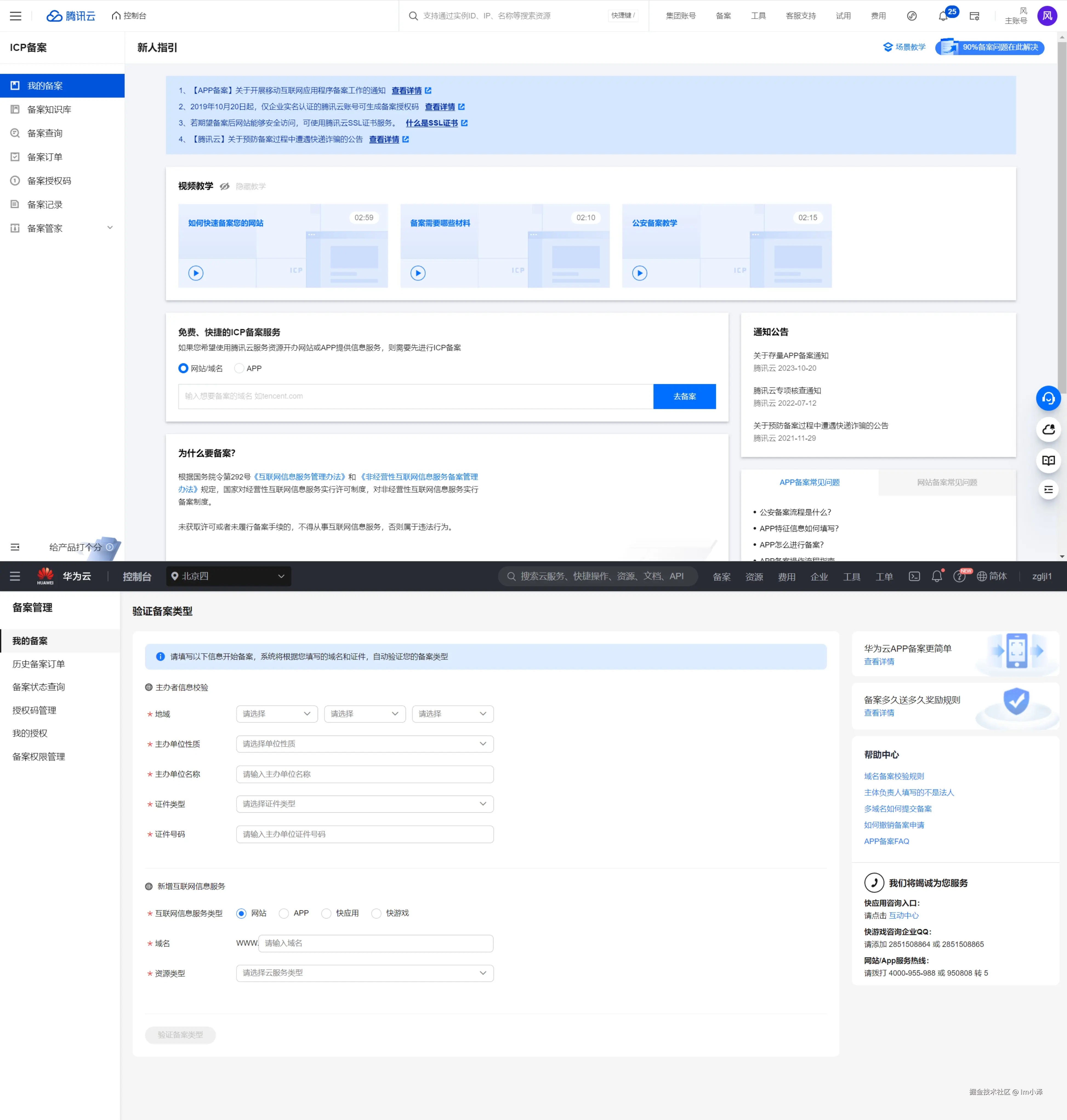 而从控制台进入备案入口就有一点五花八门了,腾讯云和华为云都比较直接,直接进入了信息填写校验的界面: