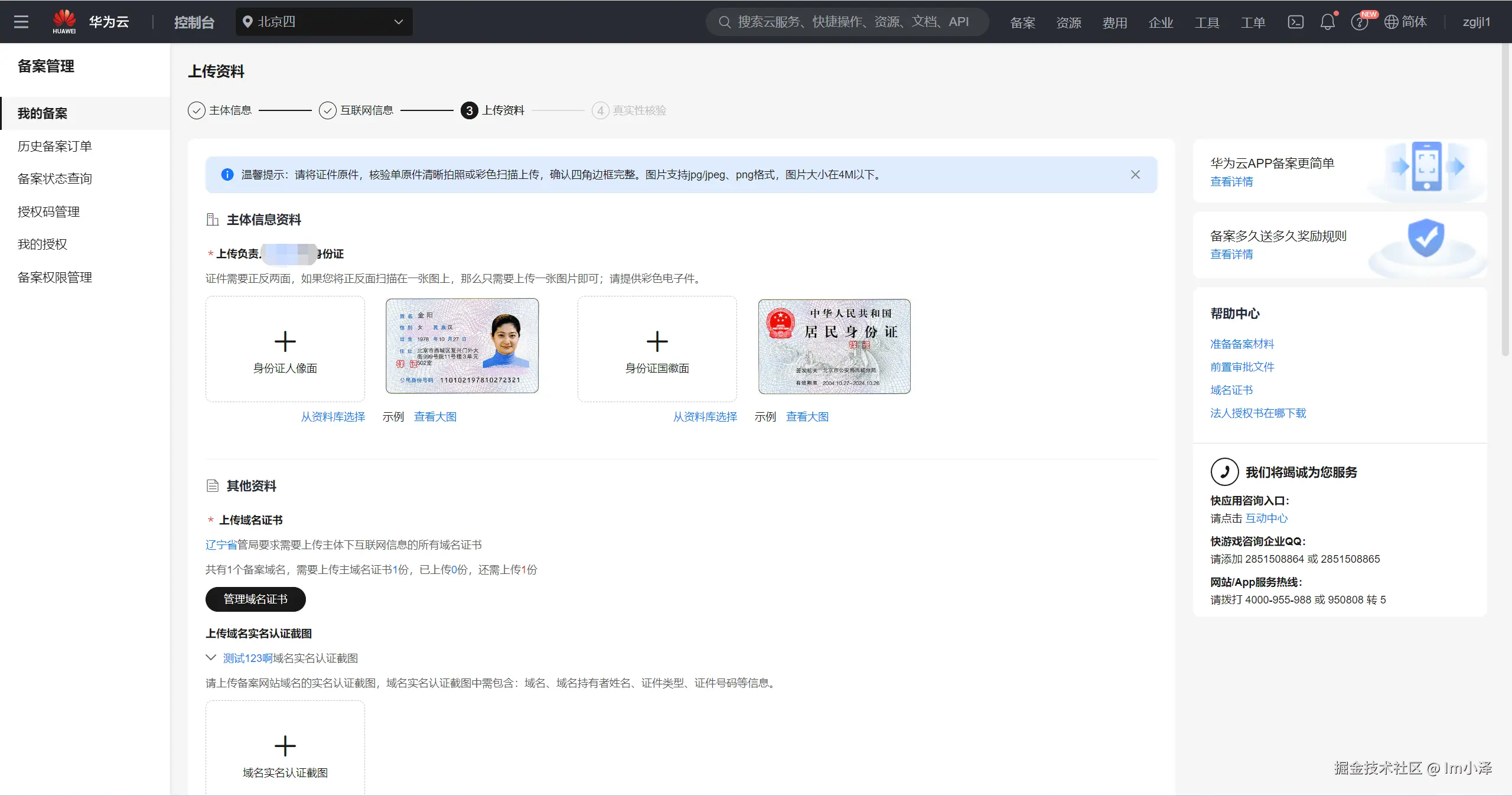 从便捷性的角度来说,我更希望我把证件上传之后你通过OCR识别的方式来为我自动填充,而不是我手动填写信息资料进去,尤其是证件住址这一个字段,其实还是比较长的,而目前只有腾讯云支持这个功能,在填写主体信息时就直接需要提供相应的证件图片从而进行识别,而阿里云和华为云至少在个人备案这一块不支持,企业备案尚不清楚: