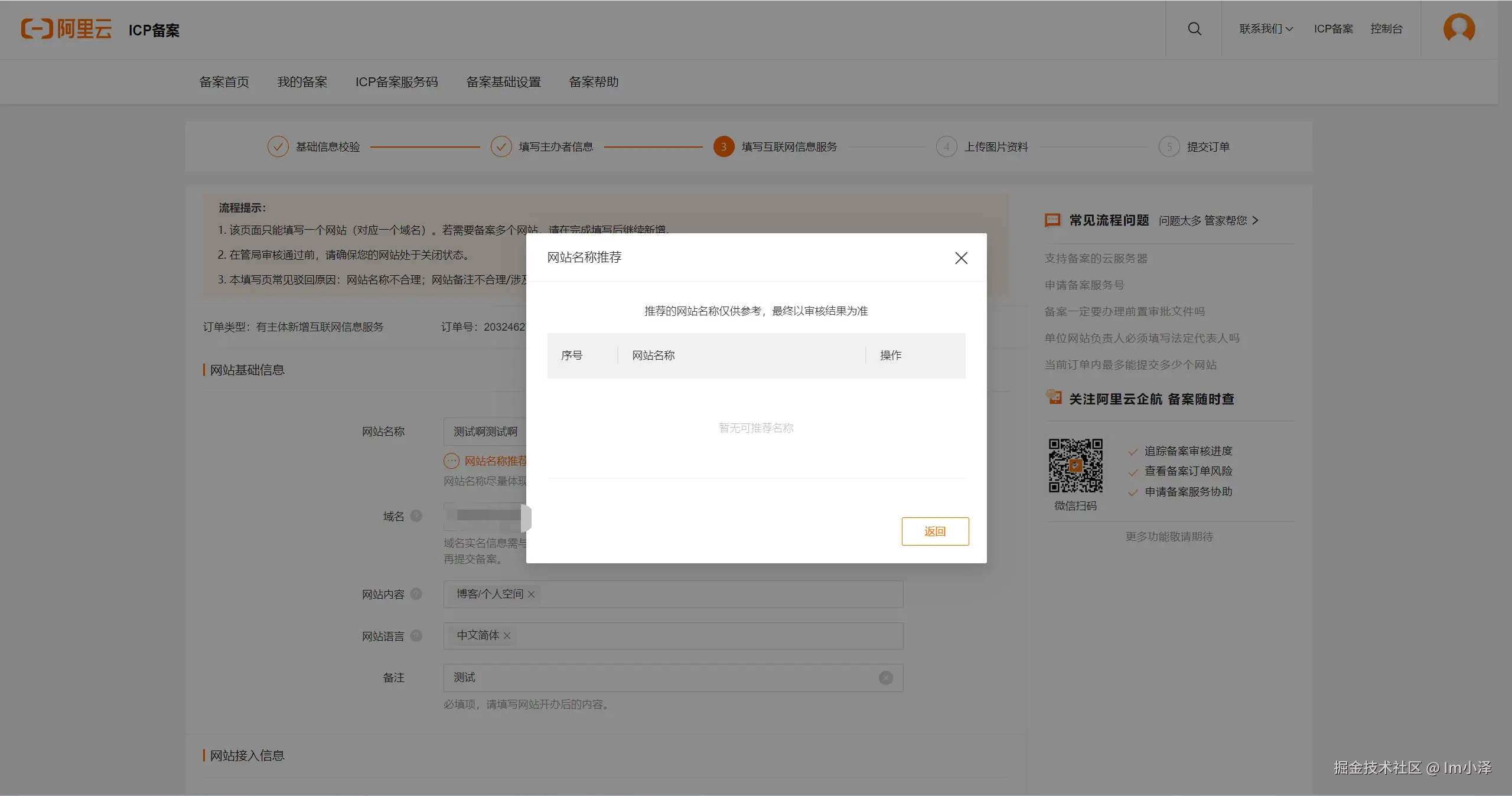 其实这里还出现了一个小插曲,第一,关于名称字数问题,别的家要求的都是三个汉字,阿里要求的的6个字符(其实就是三个汉字),但说实话,脑袋一时间没转过来,以为难道要填6个汉字了,第二,就是这个网站名称推荐,满怀期望的点进去想让他给我起个名,结果发现实际他好像是不能用的(如下):