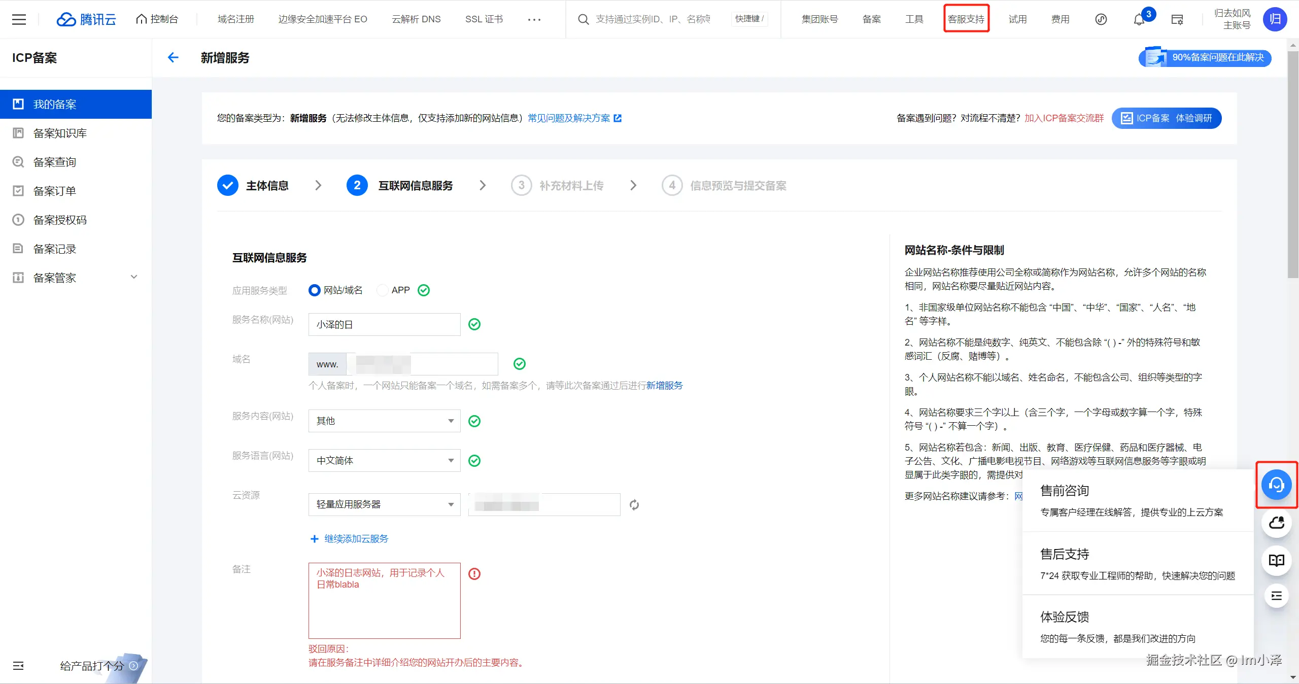在文案指引这一方面,腾讯云和华为云都做的比较详尽(如下两图所示),我可以很清楚的知道我这里应该如何填写,腾讯云甚至在部分字段的填写中展示了常见问题,这里还是比较值得称赞的: