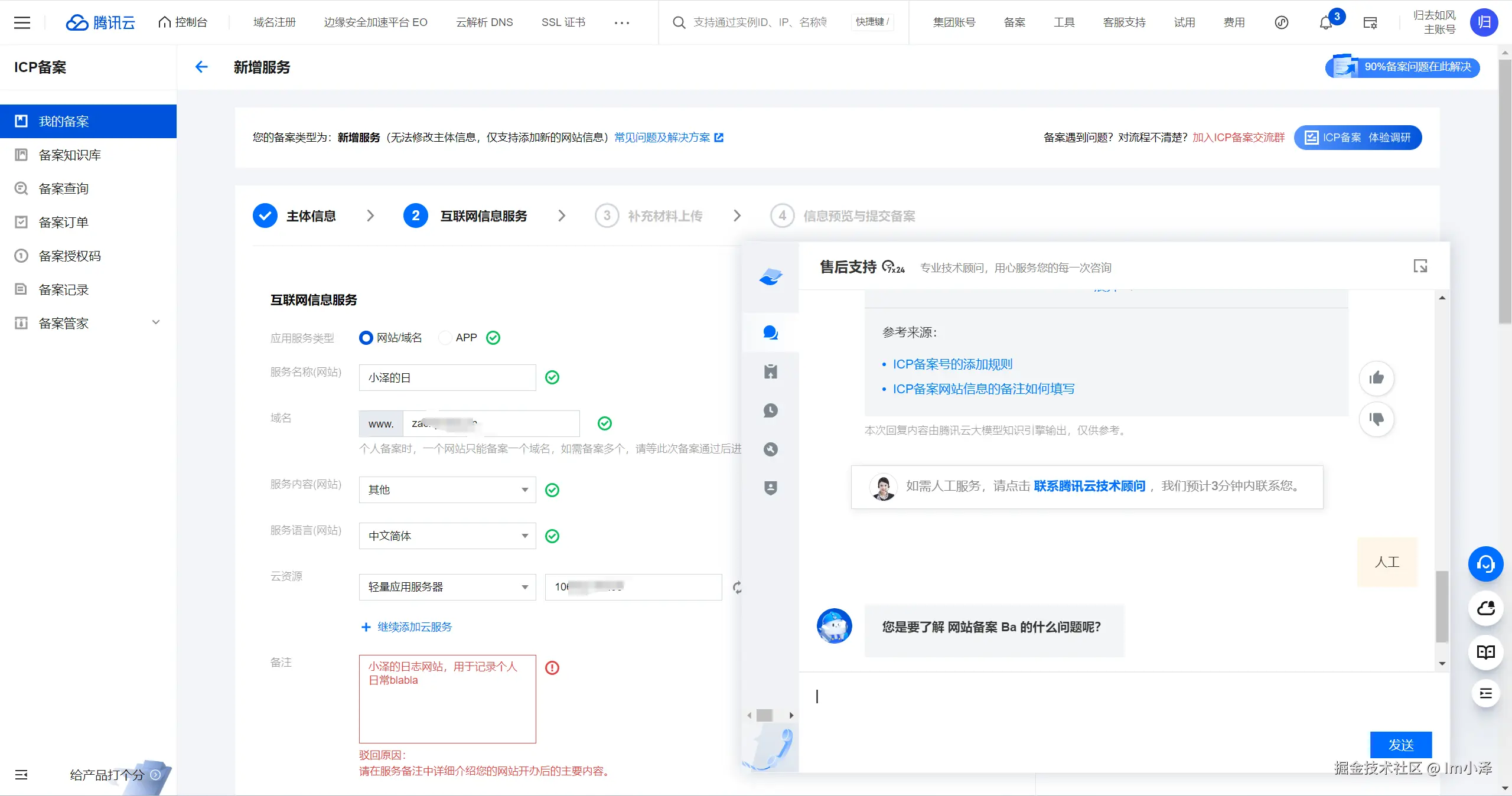 总结:腾讯云在线人工服务会前置获取备案信息,虽然填写上略复杂,但接入人工后坐席能快捷定位问题;阿里云人工不会主动询问获取主体(主办单位)信息,容易出现答非所问。华为云需要通过工单,时效相比在线人工慢些,建议通过电话咨询解决。