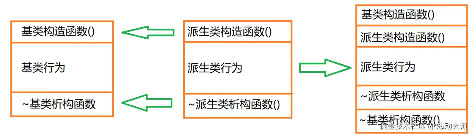但是不管它们的顺序如何,派生类构造函数总是先调用基类构造函数再执行其他代码(包括参数初始化表以及函数体中的代码),总体上看和下面的形式类似: