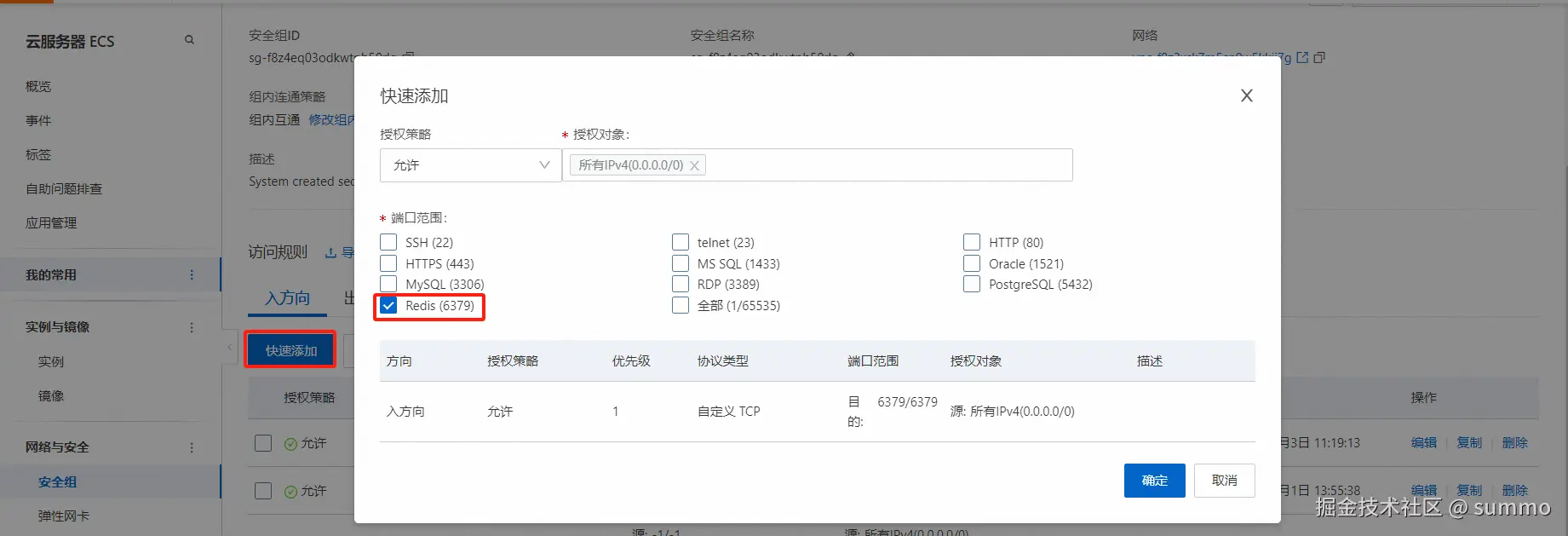 只在服务器上开放6379端口还是不行的,还需要在阿里云ECS平台修改一下