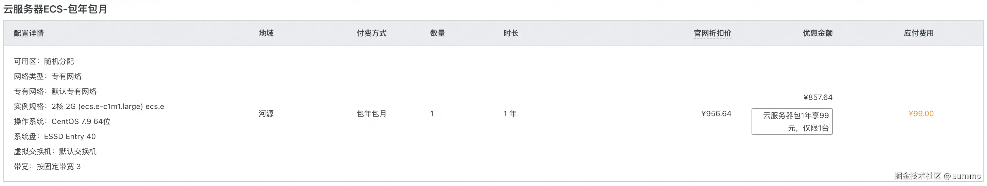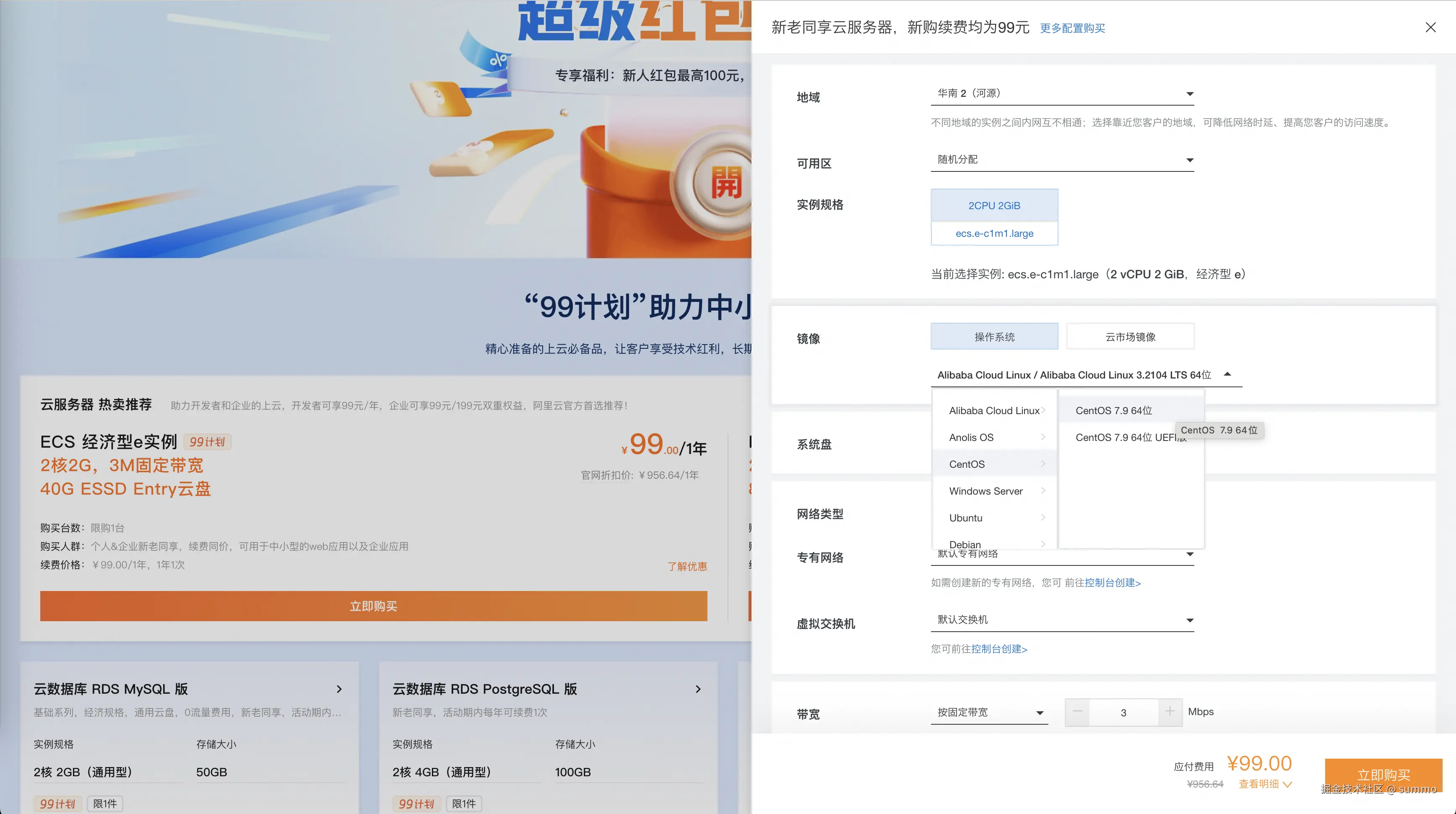 点这个链接可以进入阿里云的官方网站,我买的是2核2G,3M固定带宽这种,一年99,持续3年。这里有一个点要注意下,我选的镜像是CentOS 7.9 64位,不同镜像安装环境的方式也有点不同,比如Centos一般使用yum下载安装包而Ubuntu使用apt-get,虽然大体上都差不多但是我只熟悉Centos。如果不懂这些的话,最好跟我选一样的吧。