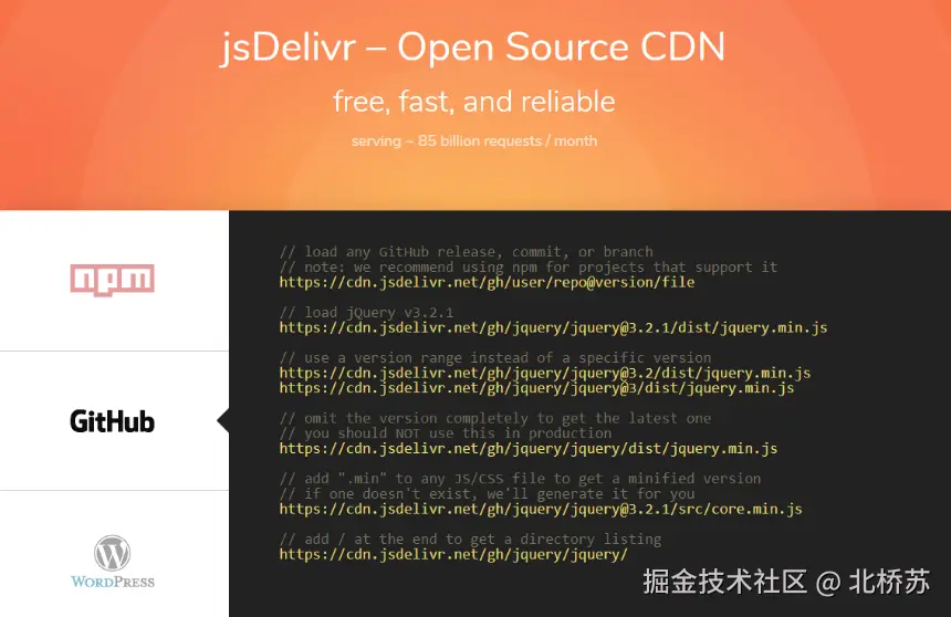 方案一提供助力,github 上的仓库和资源保持不变,只需要对其进行 CDN 加速就可以了。那么,好用的 jsDelivr 就上场了,这是一个免费、开源的加速 CDN 公共服务,托管了许多大大小小的项目,可加速访问托管的项目目录或图片资源。