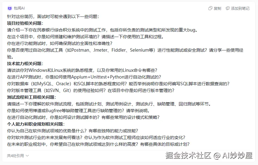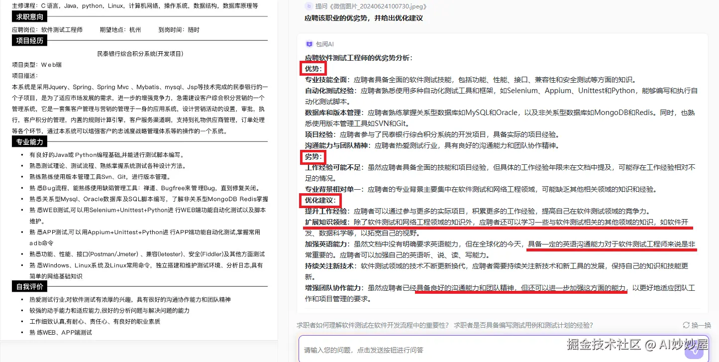 HR也可利用这个工具,辅助自己的招聘工作。只需上传求职者的简历,包阅AI就能自动帮你分析出求职者的岗位匹配度、能力分析、潜力分析、性格分析以及潜在的缺点,能够减少HR的工作负担,提高招聘工作效率。