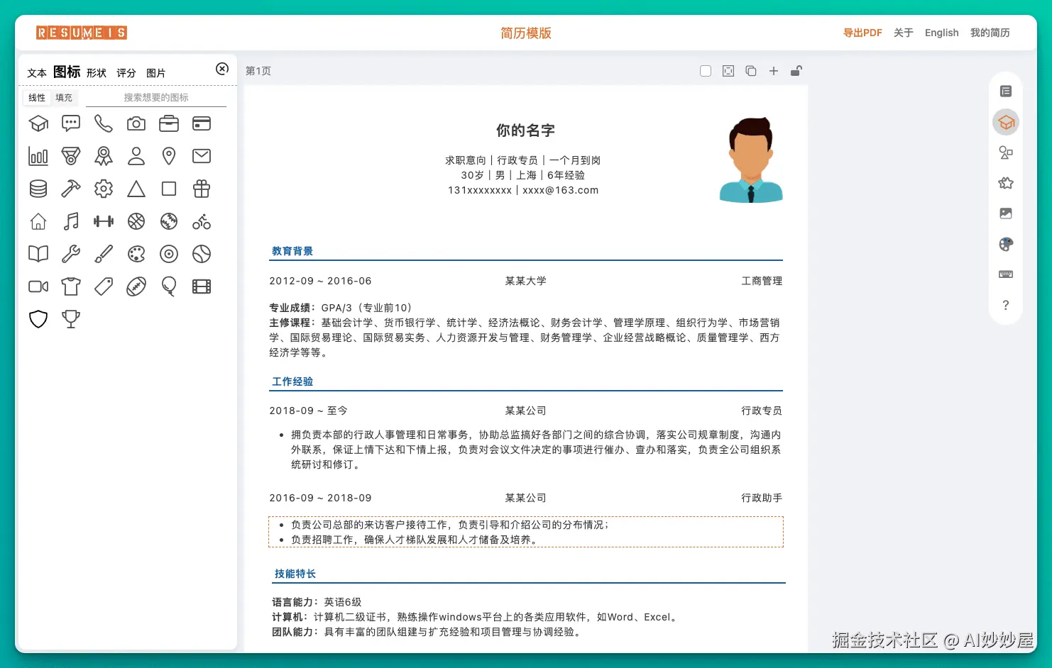 编辑器简历元素丰富,包括有文本、图标、形状、评分、图片等相关元素,可以随时拖入使用。