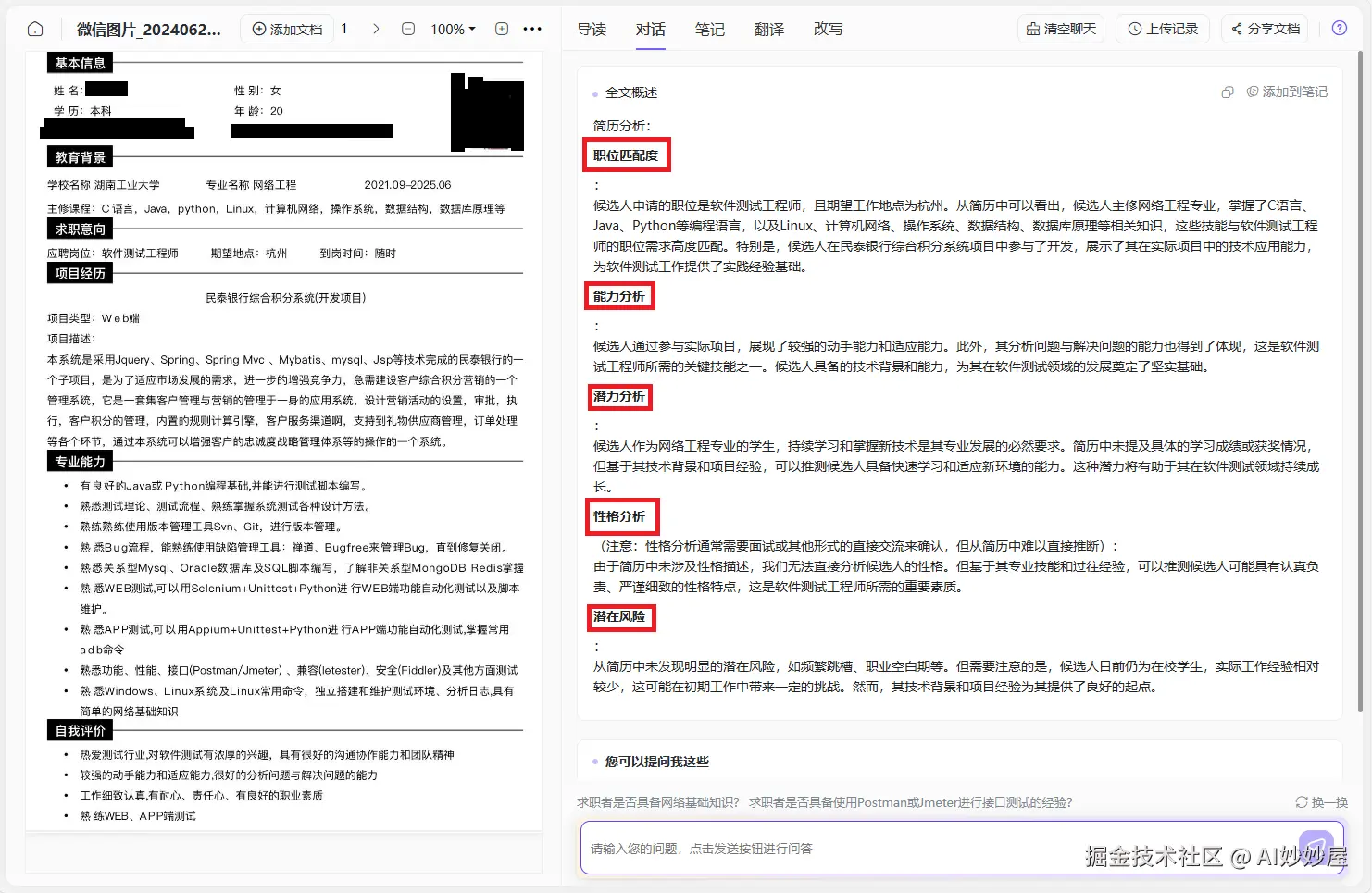 多维度评估:不仅关注简历的表面信息,如格式、排版等。还能更深入地分析简历的内在价值,从专业技能、工作经验、职业发展规划等多方面对简历进行综合评估。