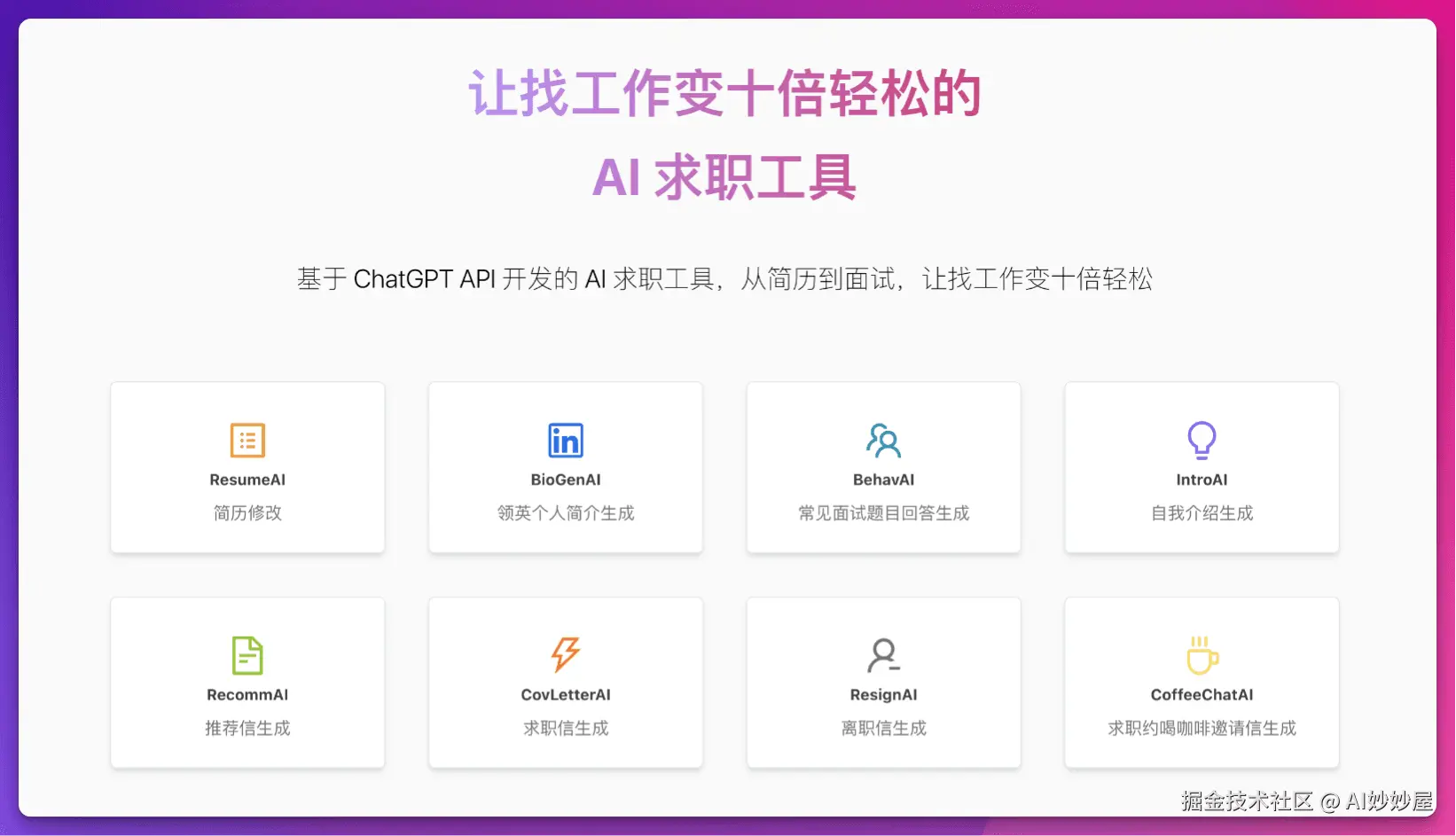 一款免费的 AI 求职工具,基于 ChatGPT API 开发,涵盖简历到面试,包括简历修改、常见面试题回答生成、自我介绍生成、介绍信和推荐信、离职信生成等各种场景,帮助求职者找工作更轻松。