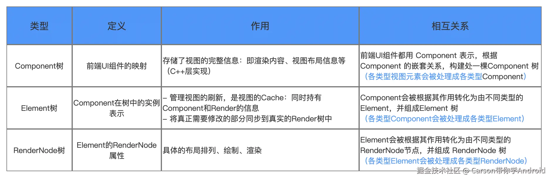 - 步骤3:根据Element树生成RenderNode树,每个Element同时持有Component和RenderNode的信息;