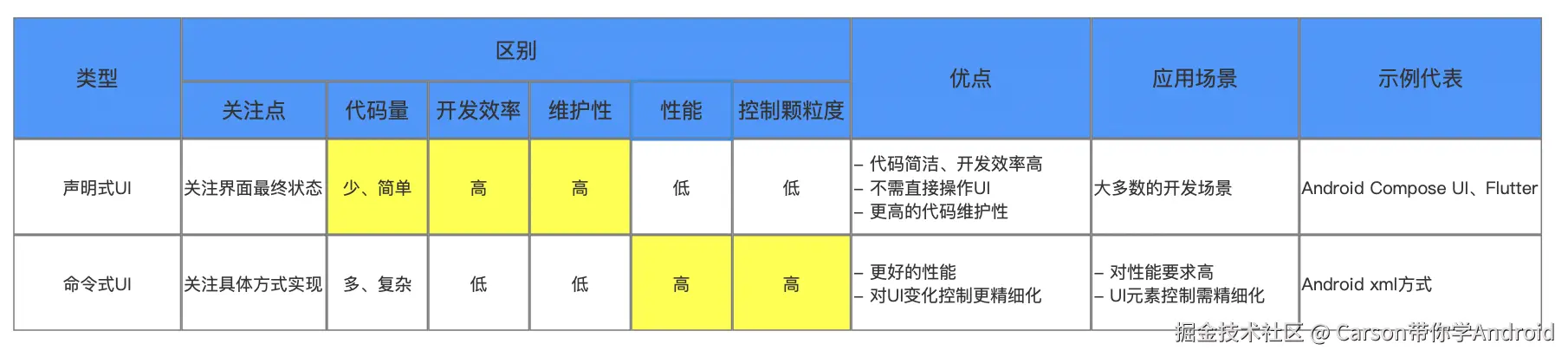 从上面可知,对于大多数开发场景来说声明式 UI更加智能、更加方便,提供了一个更高级别的抽象,简化了开发过程,特别是在复杂界面的开发场景下。具体对比如下: