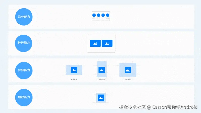比如我定义了 这四个视图元素按照屏幕宽度四等分 的规则,那么在任何尺寸下,这四个视图元素都会四等分屏幕宽度,从而达到相同的设计效果,这种在ArkUI里称为:均分能力 / 布局。