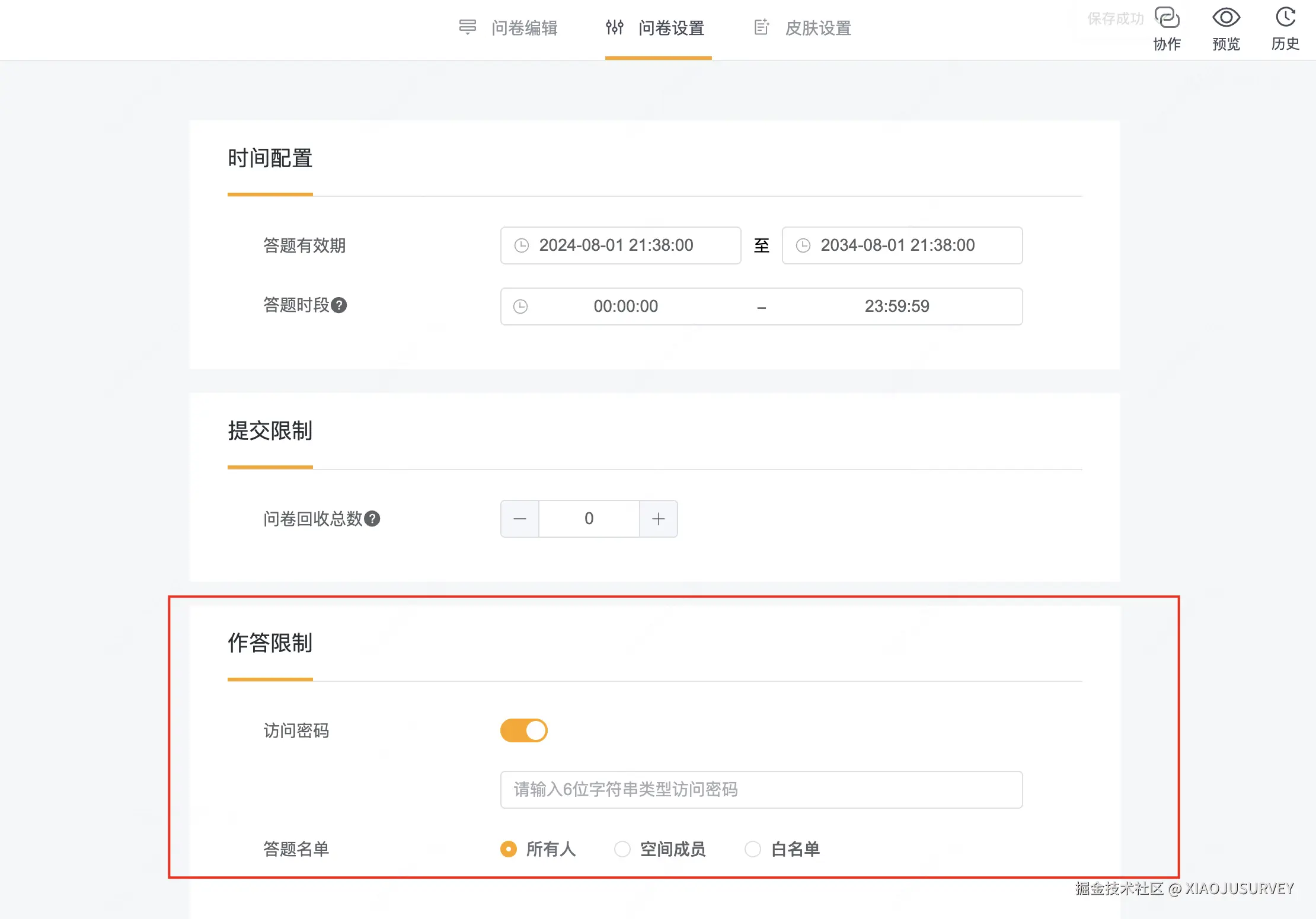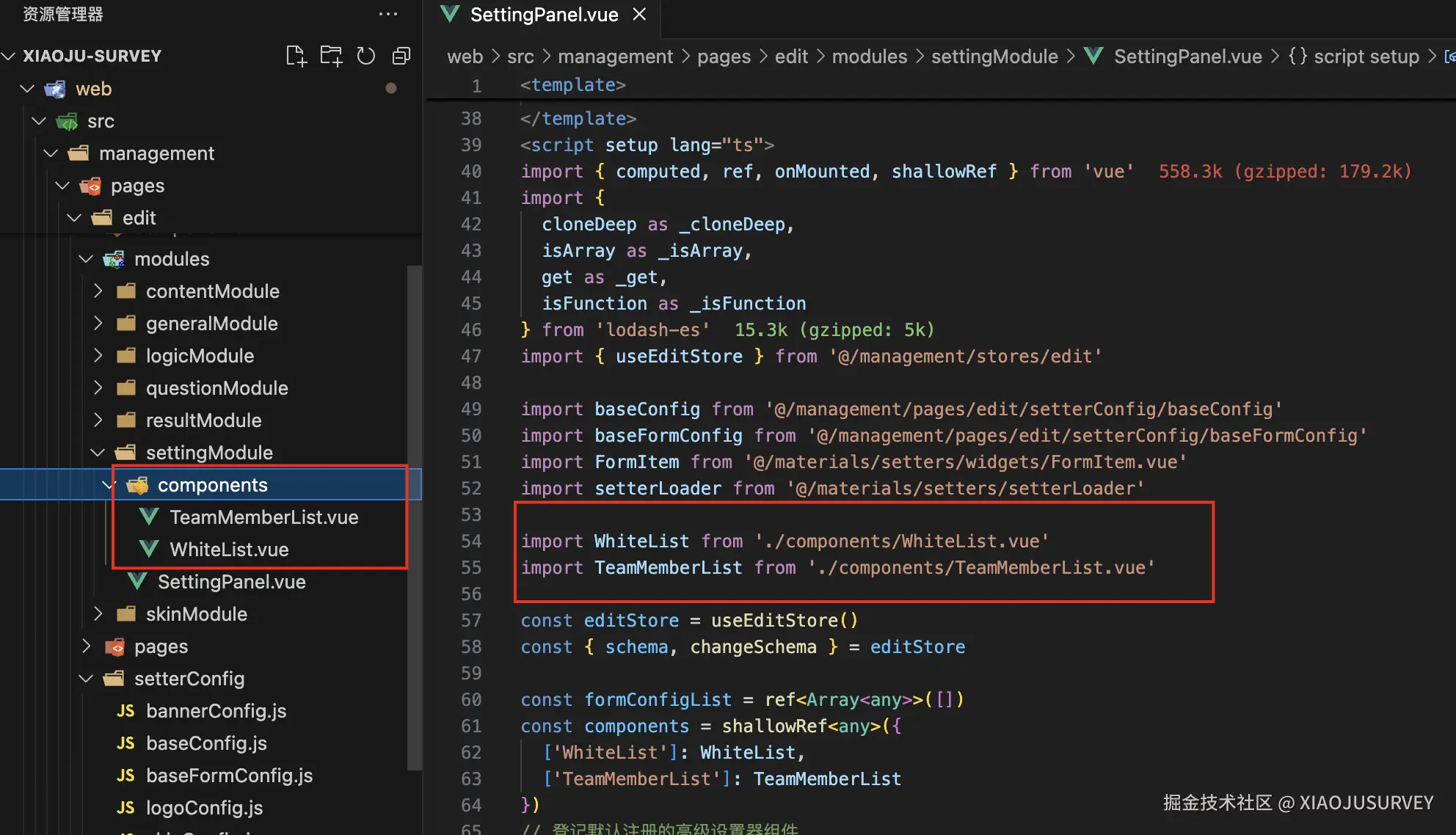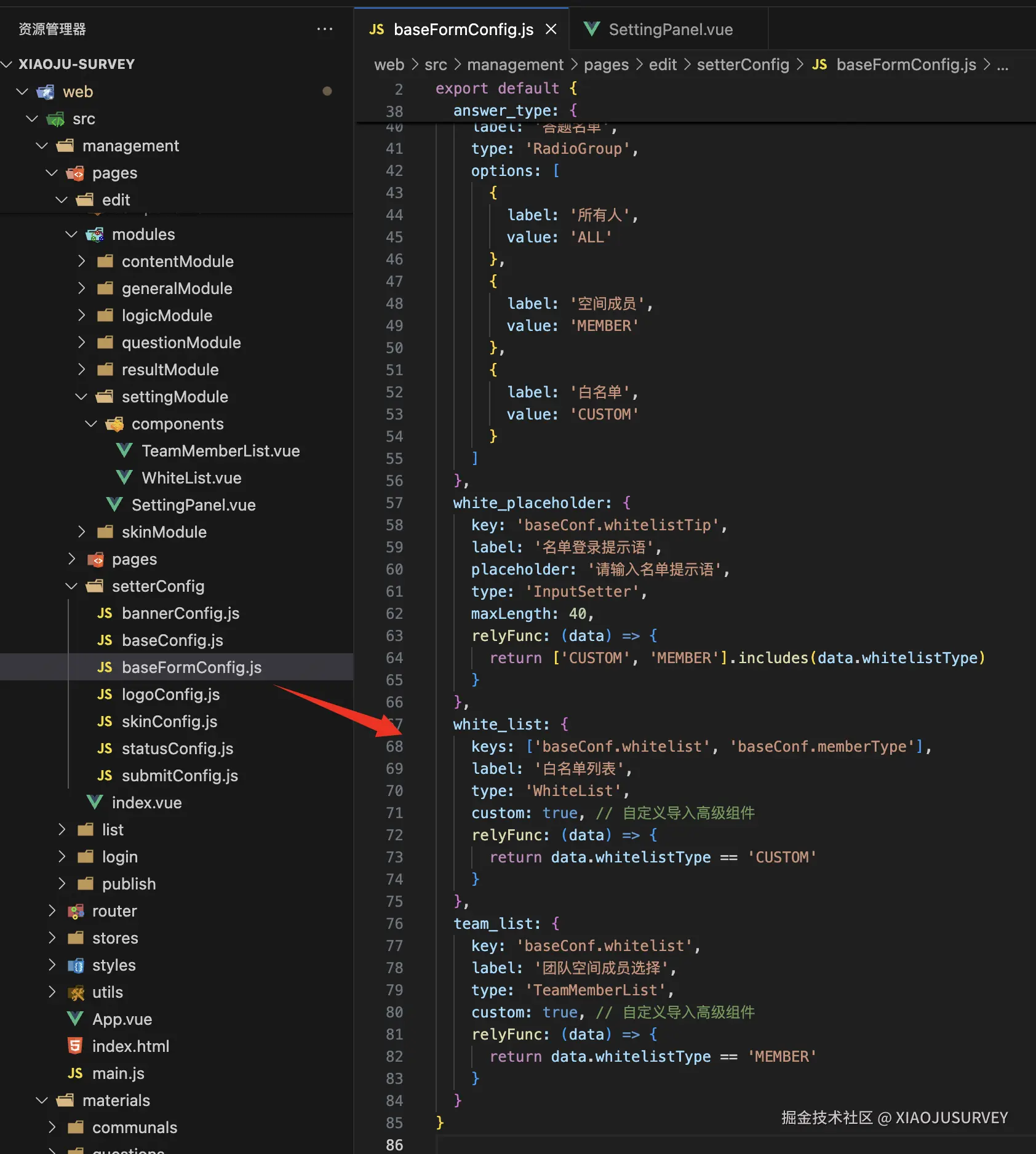 白名单列表和团队空间成员涉及接口请求和复杂视图交互,以组件的形式实现并存放在问卷设置模块里。