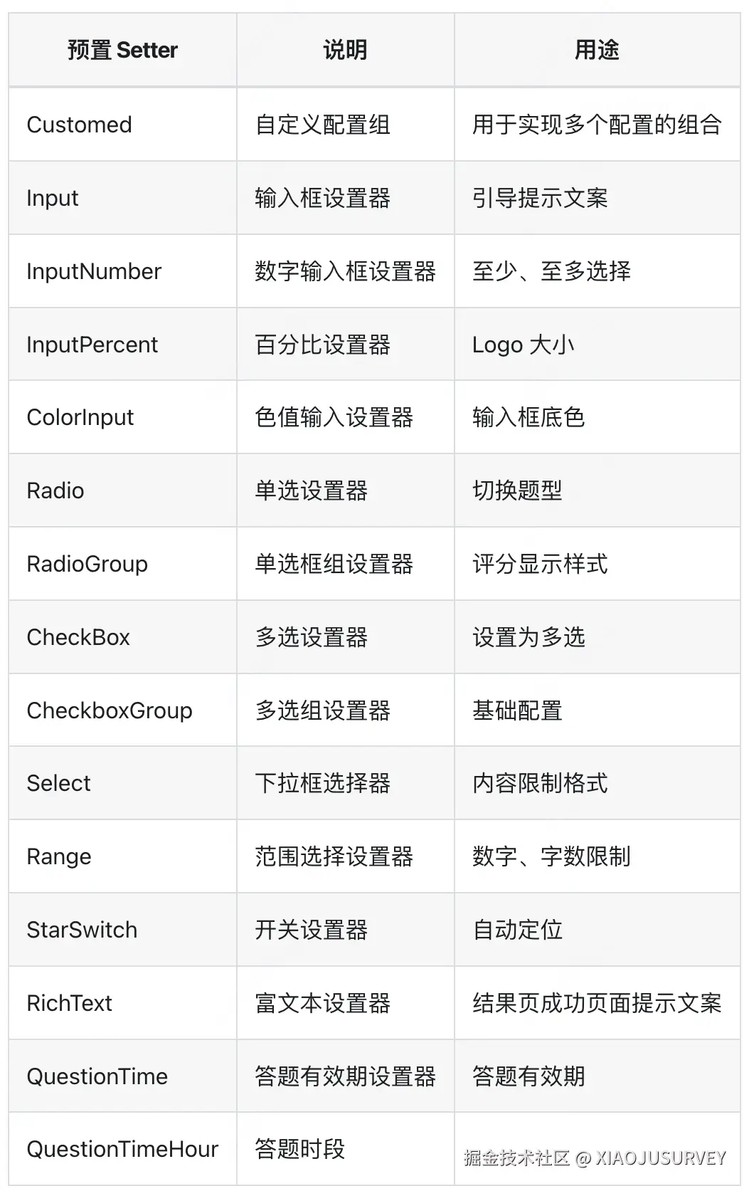 设置器主要用于问卷、题目属性值的设置,每一个设置器对应一个属性值管理。