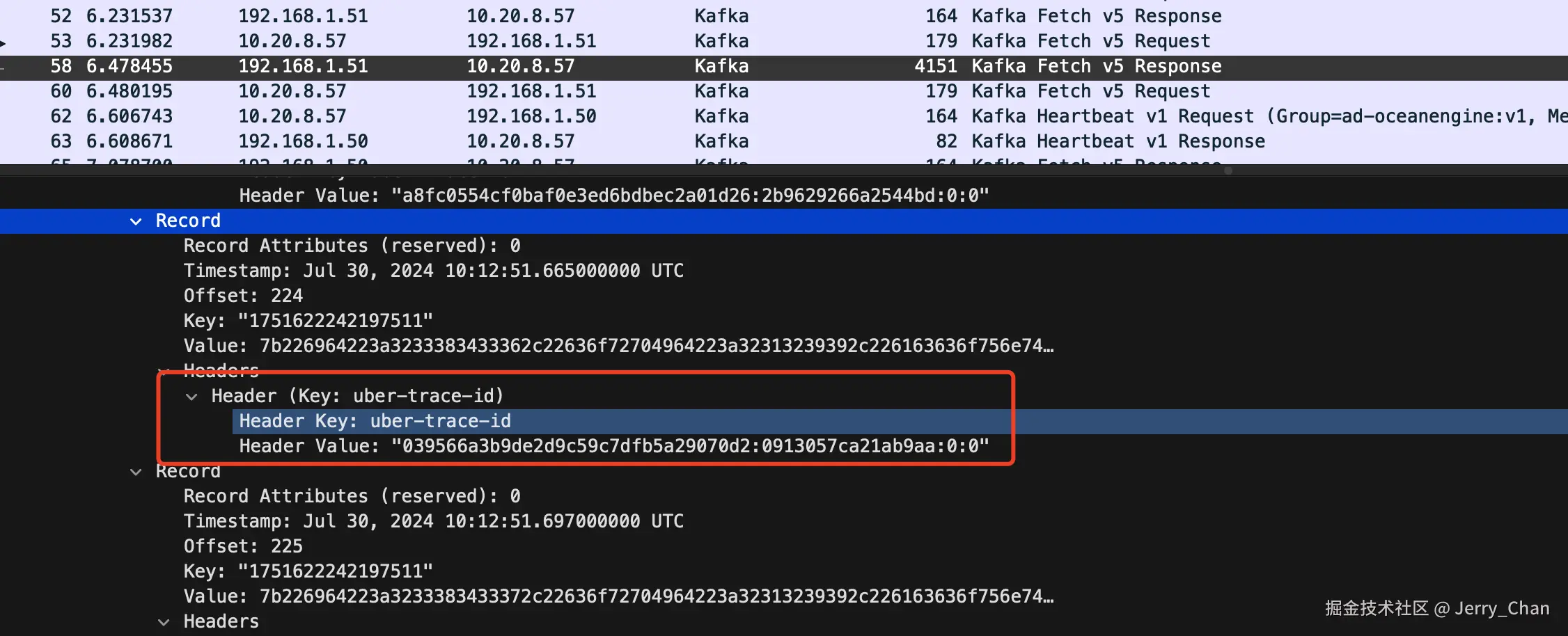 - 如果支持传播,则会将 span 组装好放到消息 header,具体参数名看使用的是什么协议,默认是 traceparent,这里使用 jaeger,所以参数名是 uber-trace-id。