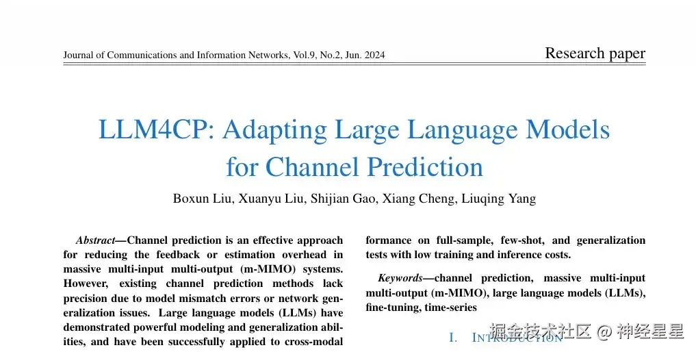 相关成果以 「LLM4CP: Adapting Large Language Models for Channel Prediction」为题,发表于期刊 「Journal of Communications and Information Networks」上。